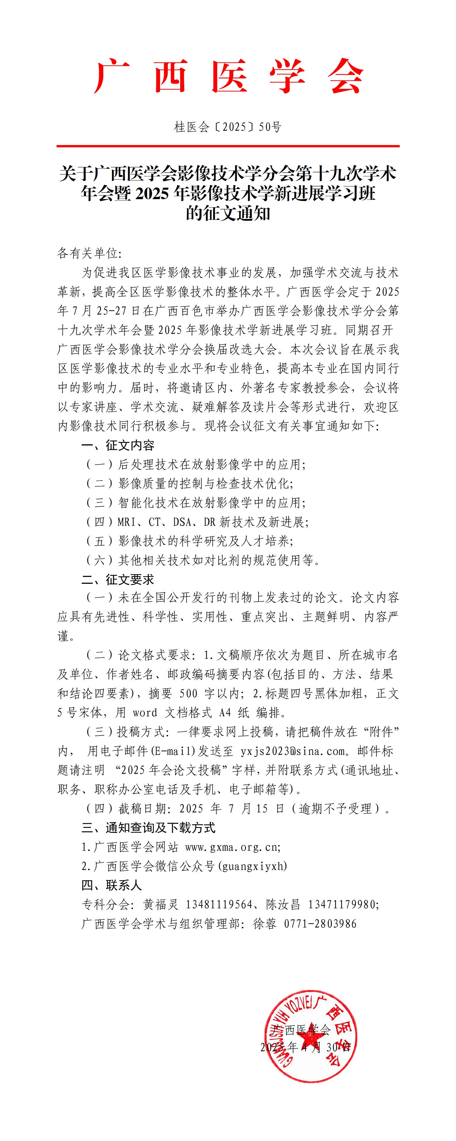 关于召开广西医学会影像技术学第十九次学术年会暨2025年影像技术学新进展学习班的预通知