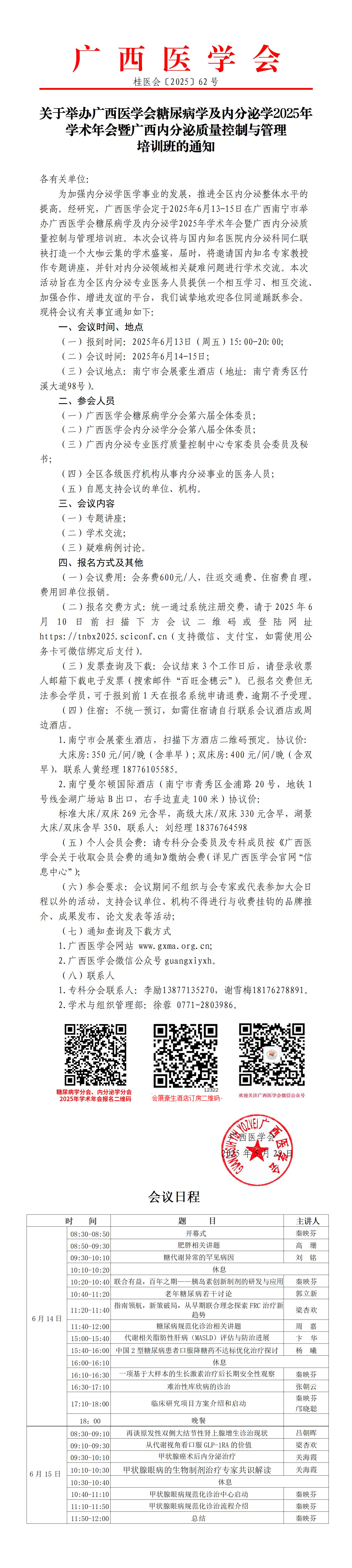 关于举办广西医学会糖尿病学及内分泌学2025年学术年会暨广西内分泌质量控制与管理培训班的通知