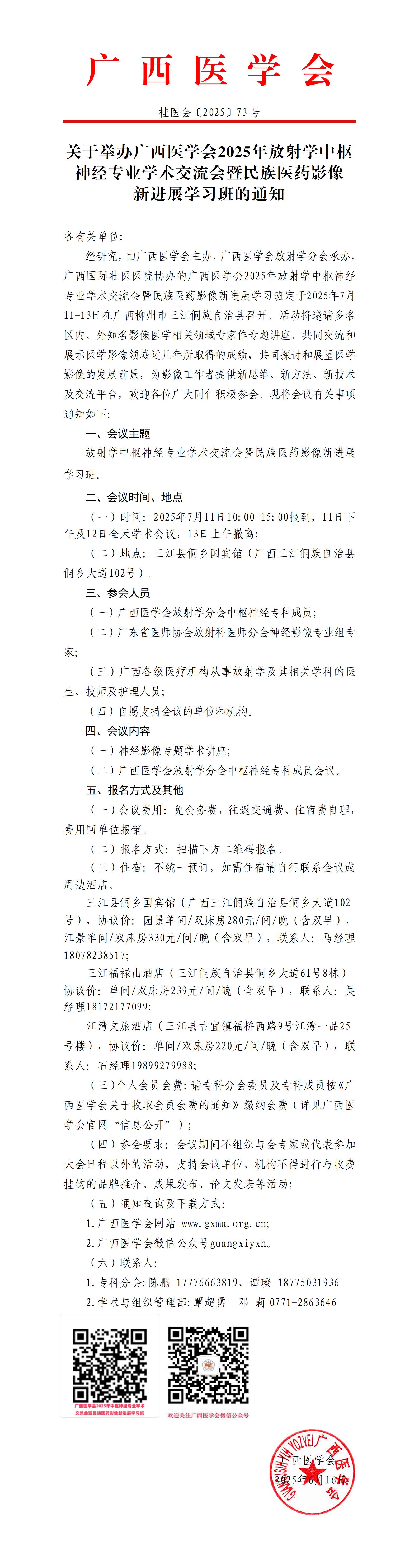 关于举办广西医学会2025年放射学中枢神经专业学术交流会暨民族医药影像新进展学习班的通知