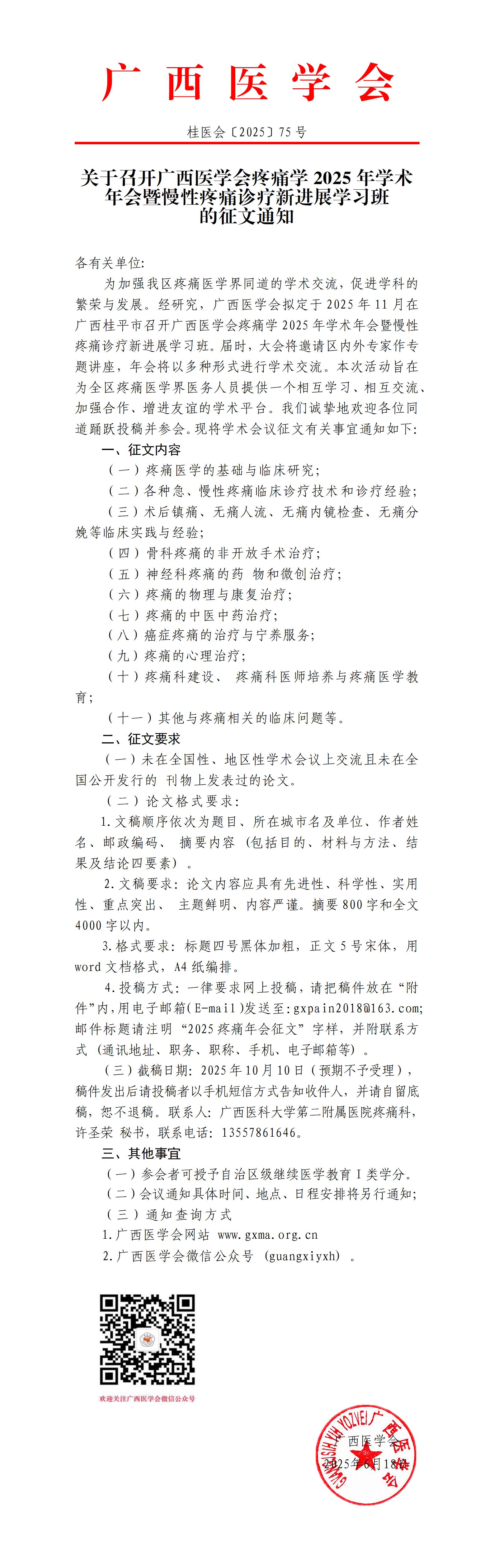 关于召开广西医学会疼痛学2025年学术年会暨慢性疼痛诊疗新进展学习班的征文通知