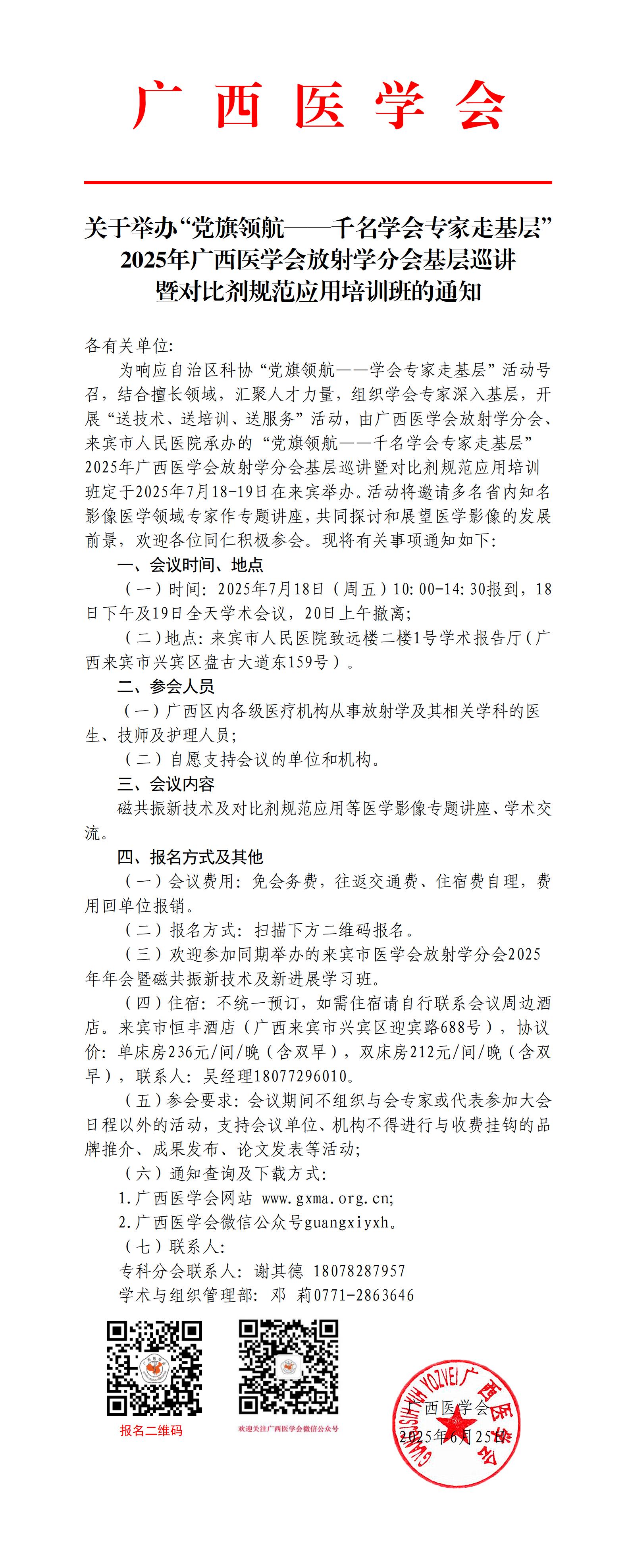 关于举办“党旗领航——千名学会专家走基层”2025年广西医学会放射学分会基层巡讲暨对比剂规范应用培训班的通知