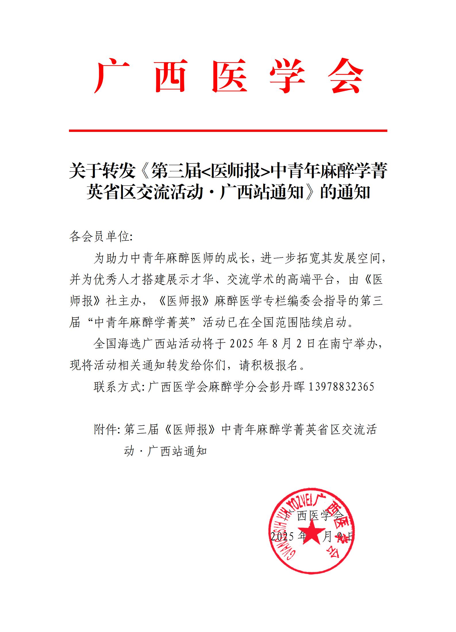 关于转发《第三届<医师报>中青年麻醉学菁英省区交流活动·广西站通知》的通知