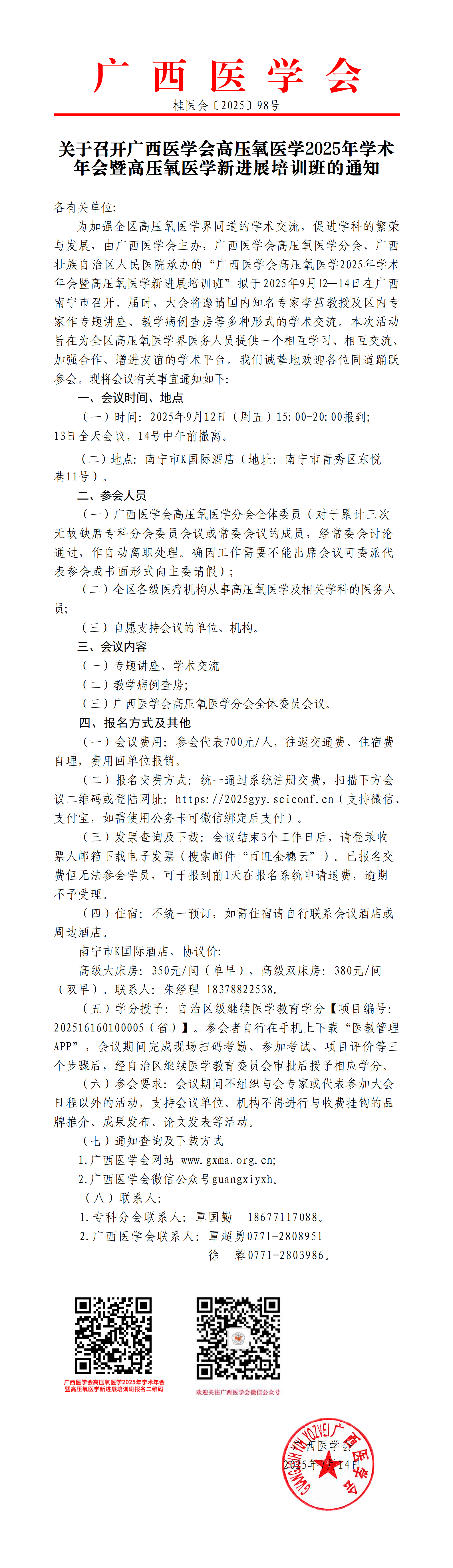 关于召开广西医学会高压氧医学2025年学术年会暨高压氧医学新进展培训班的通知