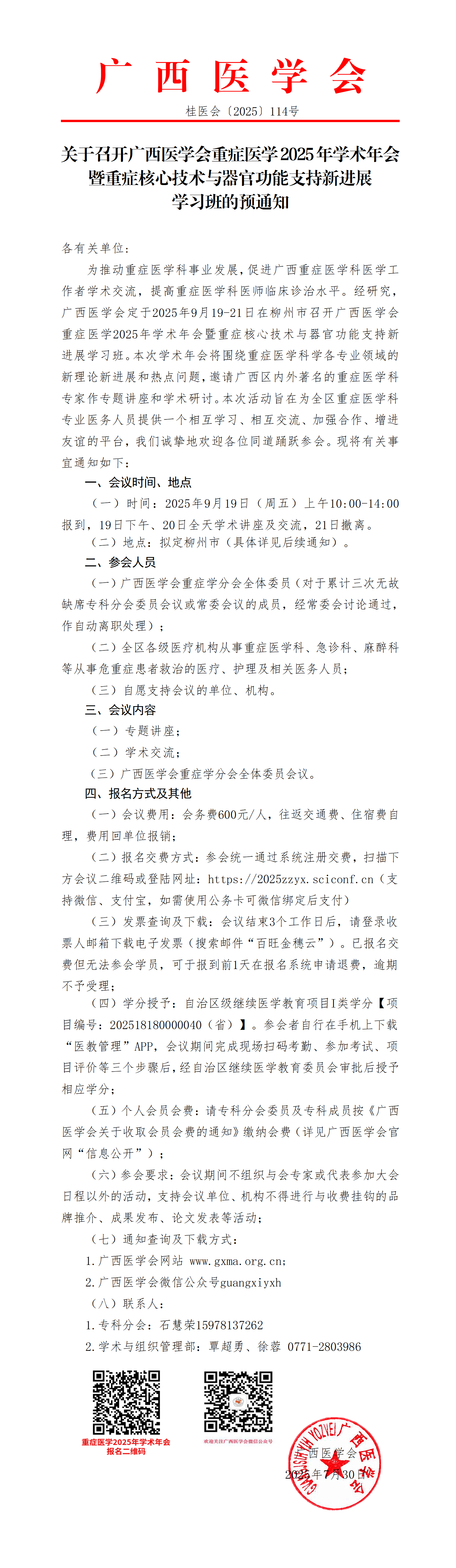 关于召开广西医学会重症医学2025年学术年会暨重症核心技术与器官功能支持新进展学习班的预通知