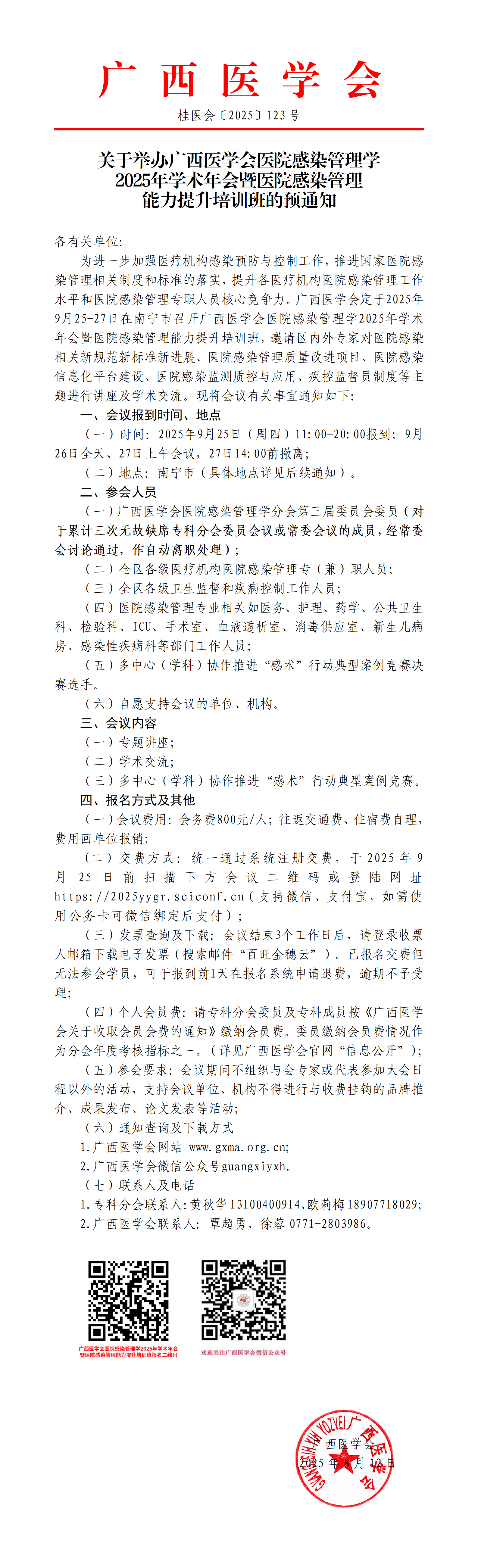 关于举办广西医学会医院感染管理学2025年学术年会暨医院感染管理能力提升培训班的预通知