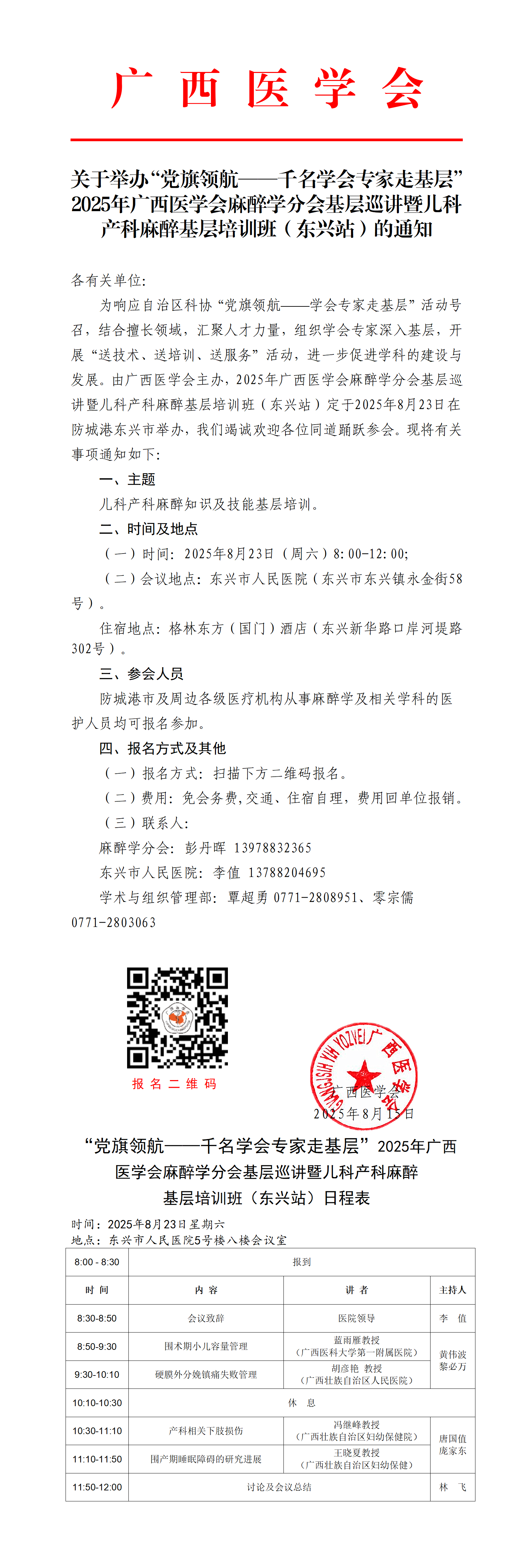 关于举办“党旗领航——千名学会专家走基层” 2025年广西医学会麻醉学分会基层巡讲暨儿科 产科麻醉基层培训班(东兴站)的通知