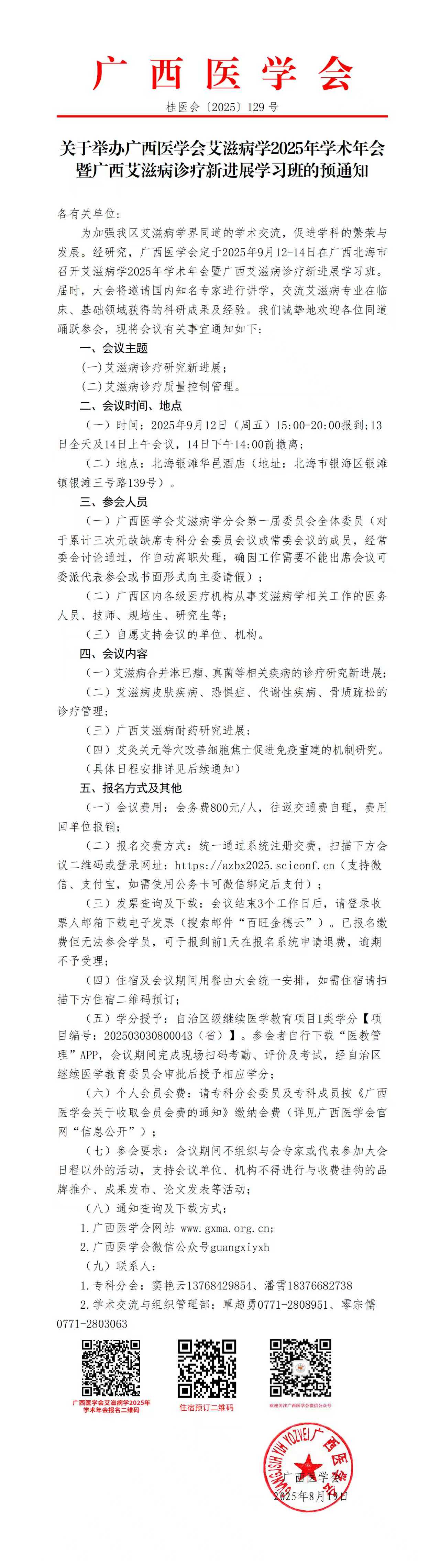 关于举办广西医学会艾滋病学2025年学术年会暨广西艾滋病诊疗新进展学习班的预通知