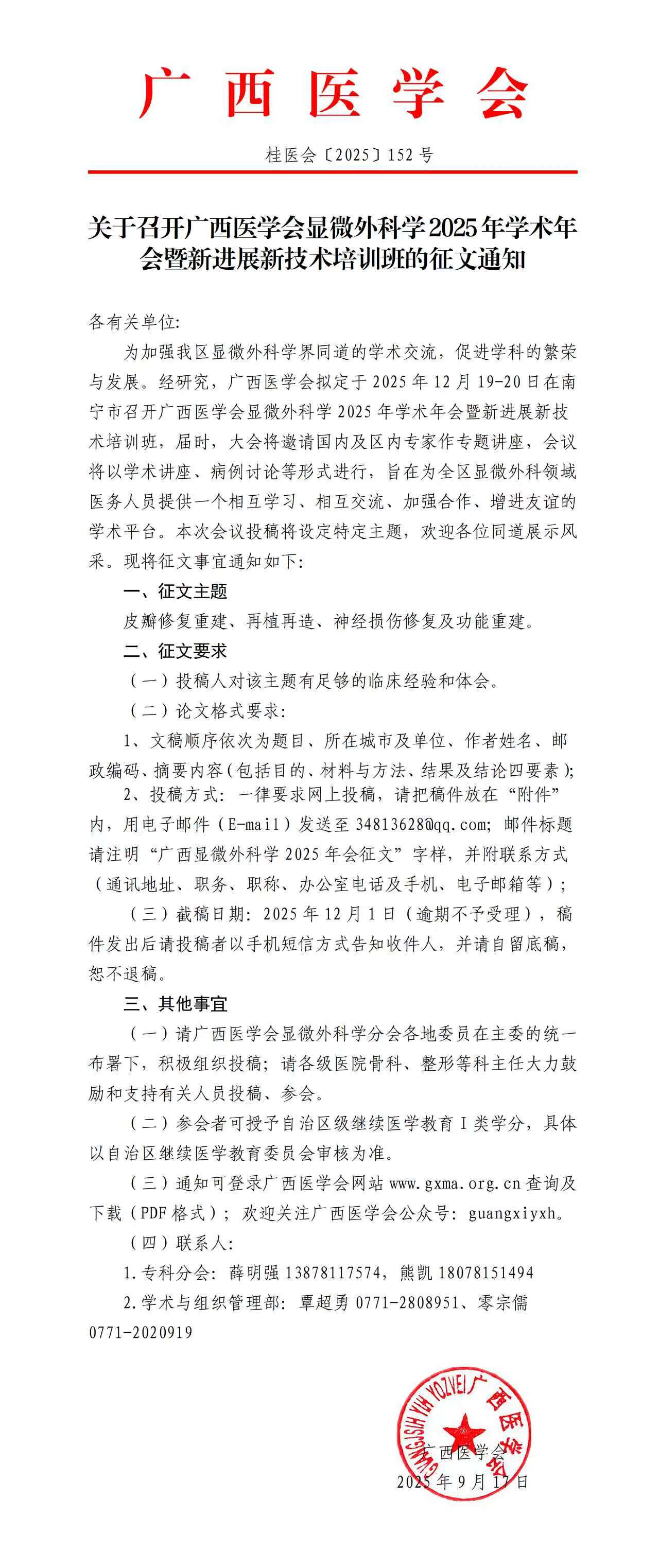 关于召开广西医学会显微外科学2025年学术年会暨新进展新技术培训班的征文通知