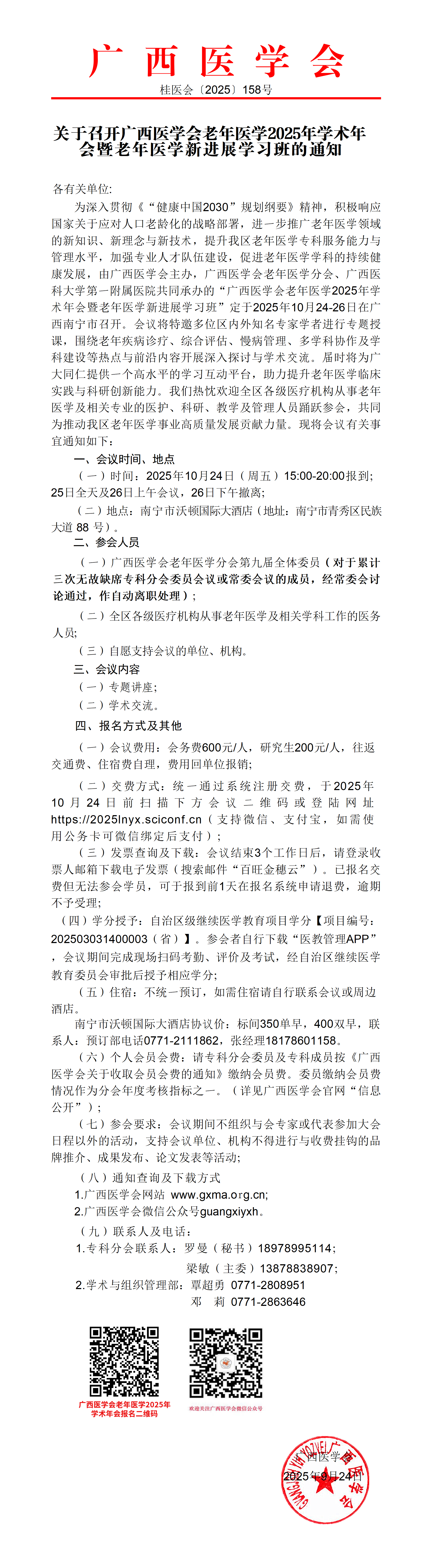 关于召开广西医学会老年医学2025年学术年会暨老年医学新进展学习班的通知