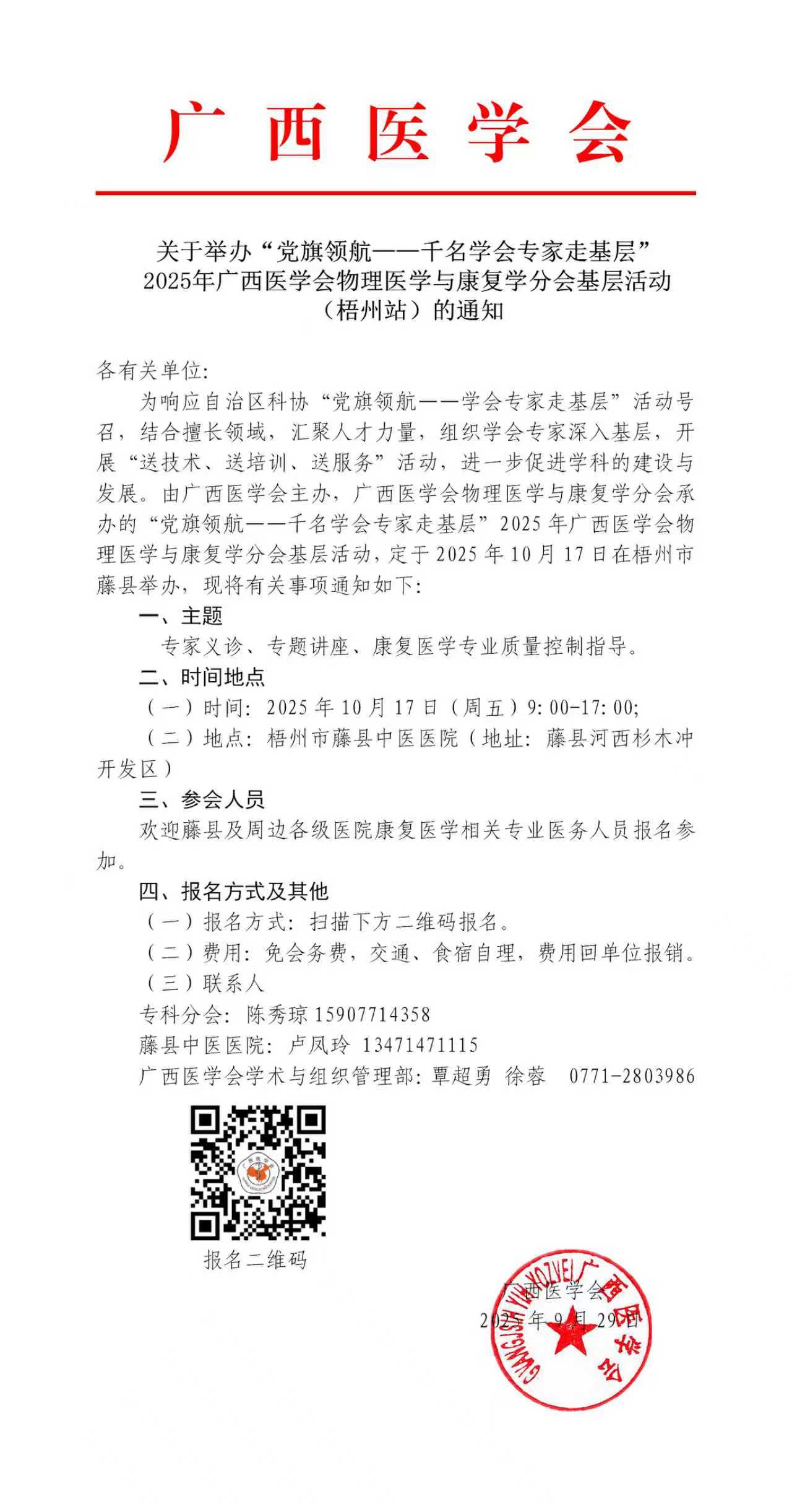 关于举办“党旗领航——千名学会专家走基层” 2025年广西医学会物理医学与康复学分会基层活动 (梧州站)的通知