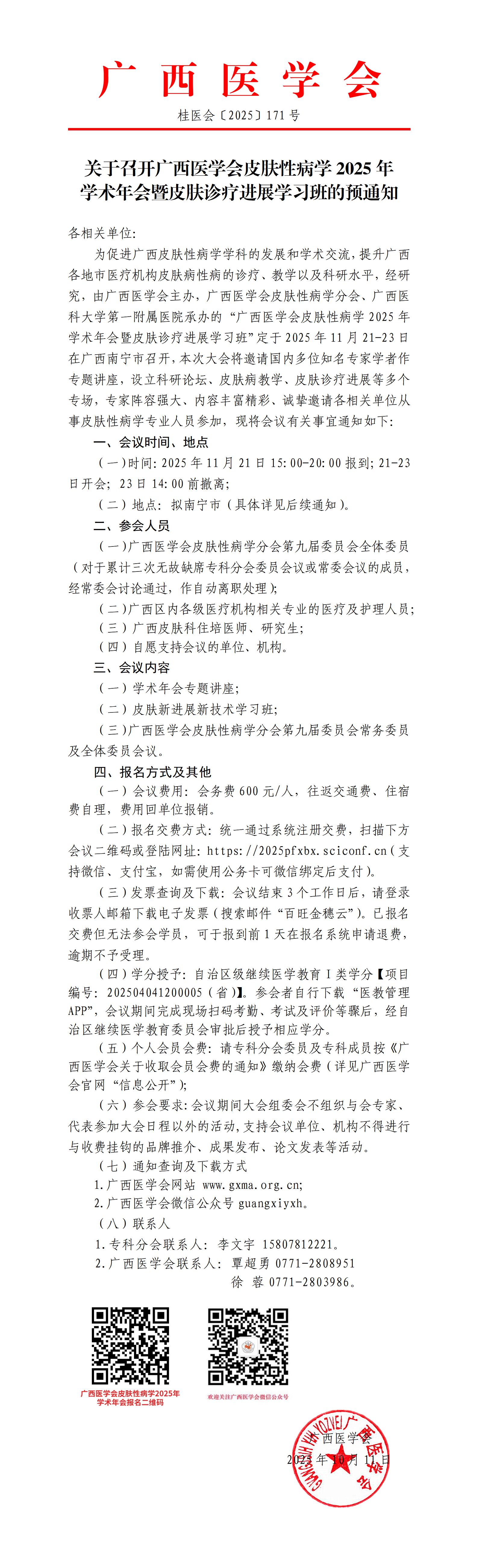 关于召开广西医学会皮肤性病学2025年学术年会暨皮肤诊疗进展学习班的预通知