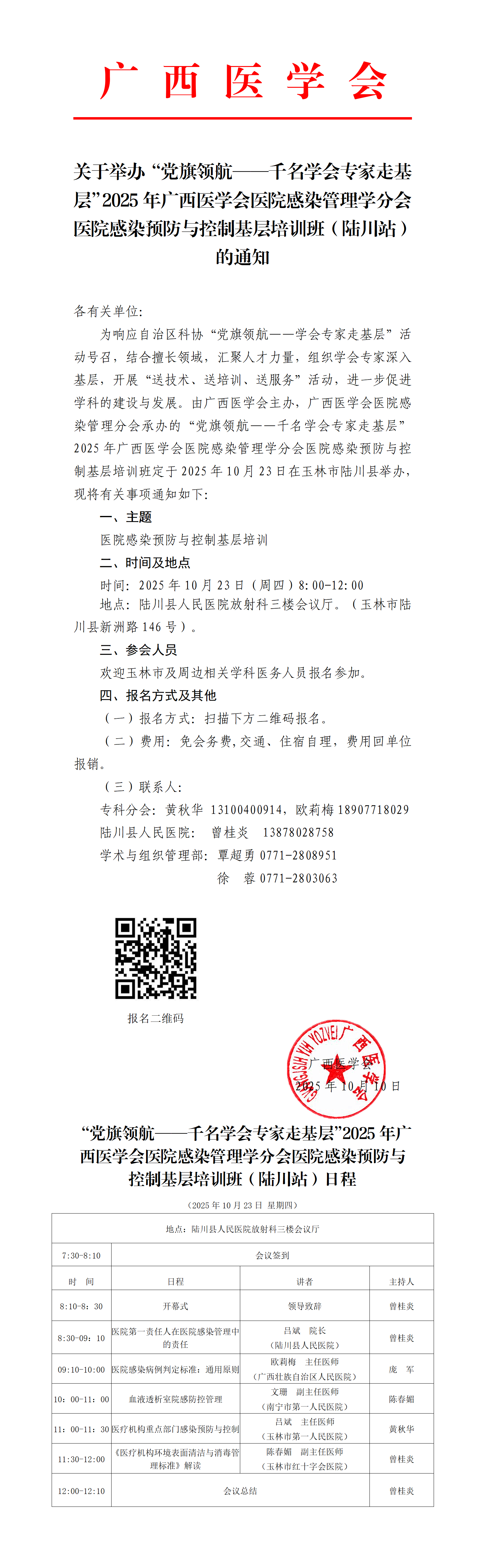 关于举办“党旗领航——千名学会专家走基层”2025年广西医学会医院感染管理学分会医院感染预防与控制基层培训班(陆川站)的通知