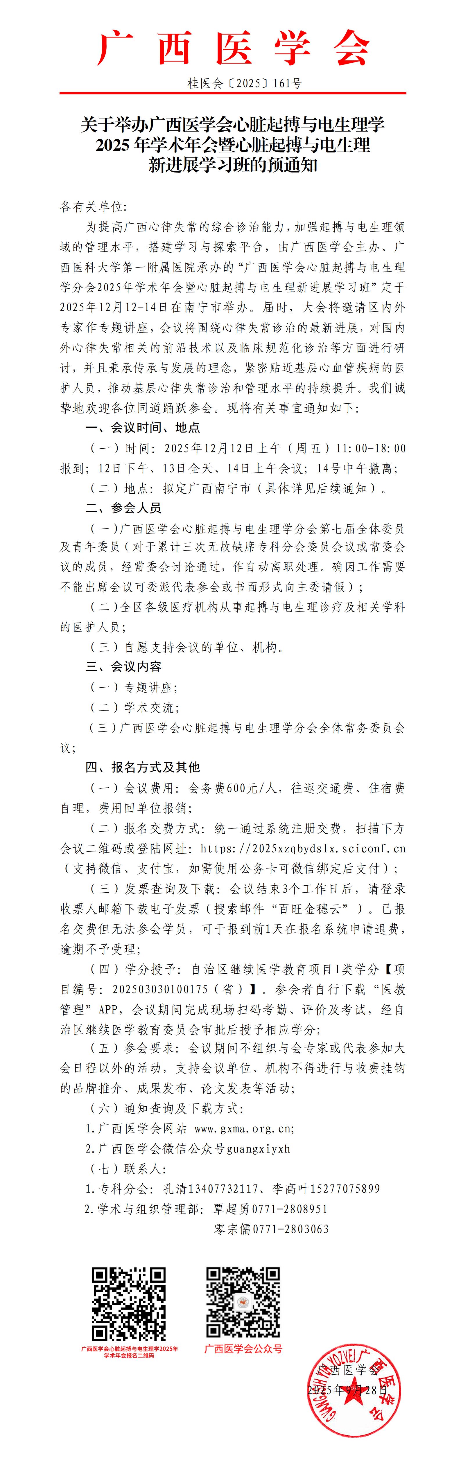关于举办广西医学会心脏起搏与电生理学2025年学术年会暨心脏起搏与电生理新进展学习班的预通知