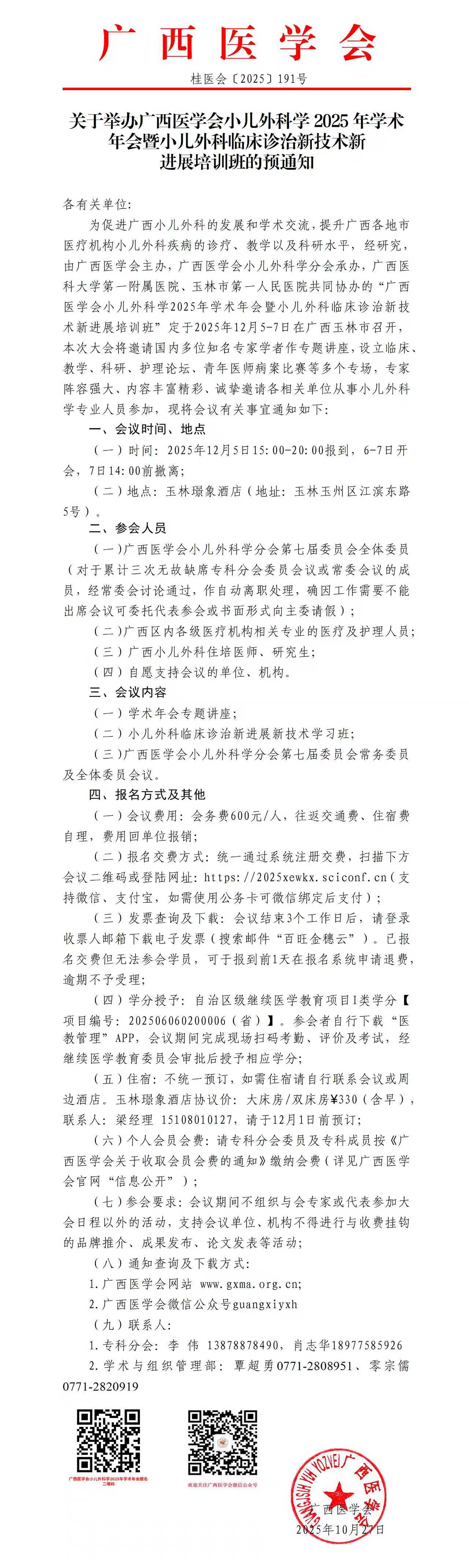 关于举办广西医学会小儿外科学2025年学术年会暨小儿外科临床诊治新技术新进展培训班的预通知