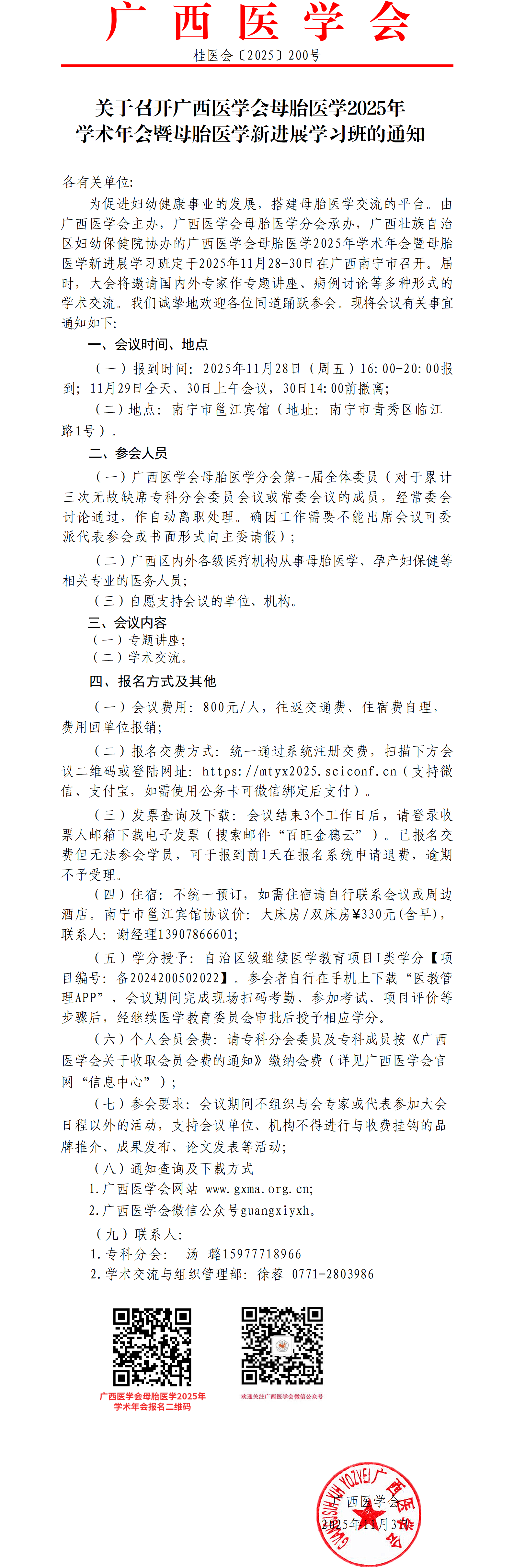 关于召开广西医学会母胎医学2025年学术年会暨母胎医学新进展学习班的通知