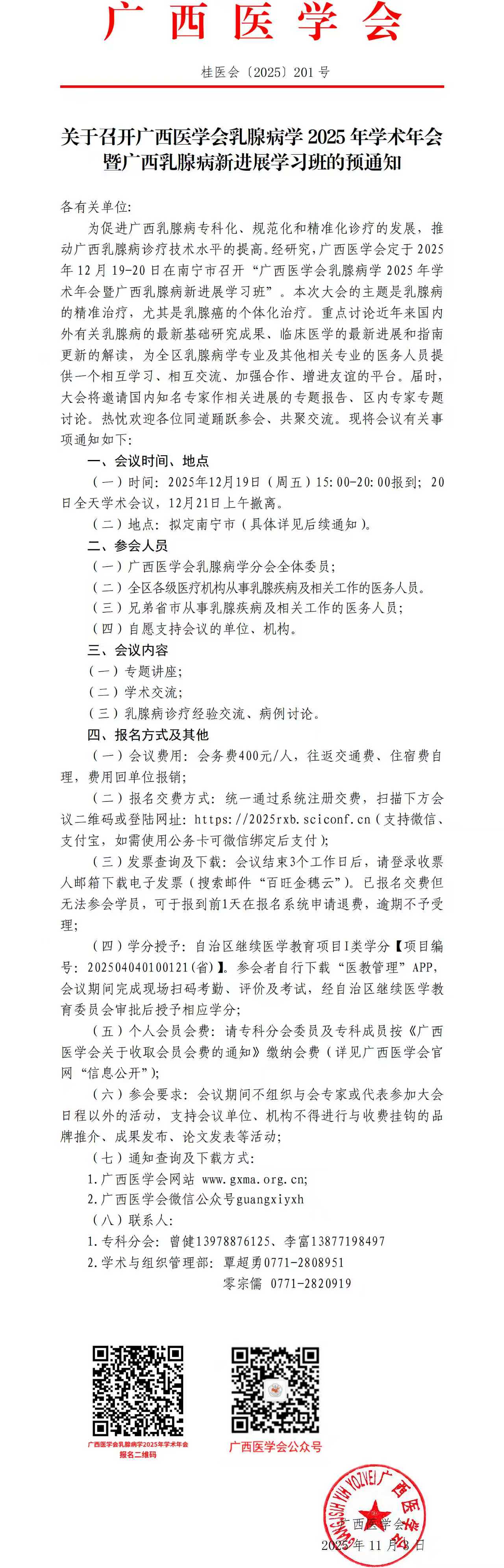 关于召开广西医学会乳腺病学 2025 年学术年会暨广西乳腺病新进展学习班的预通知