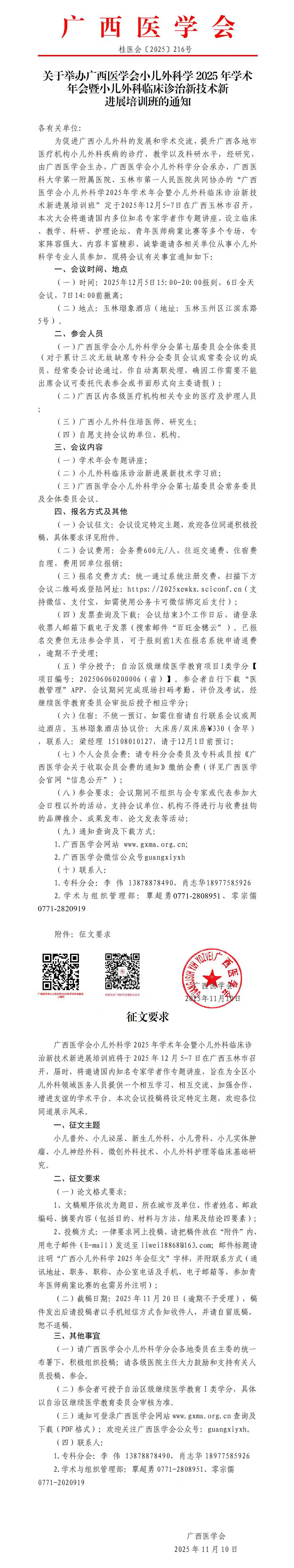 关于举办广西医学会小儿外科学2025年学术年会暨小儿外科临床诊治新技术新进展培训班的通知