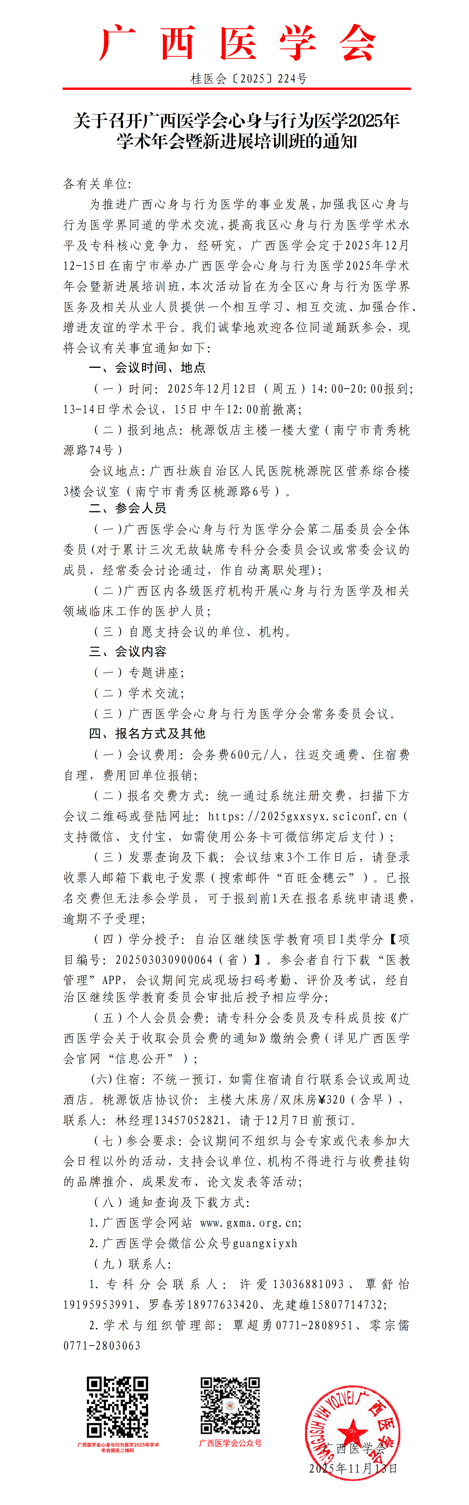 关于召开广西医学会心身与行为医学2025年学术年会暨新进展培训班的通知