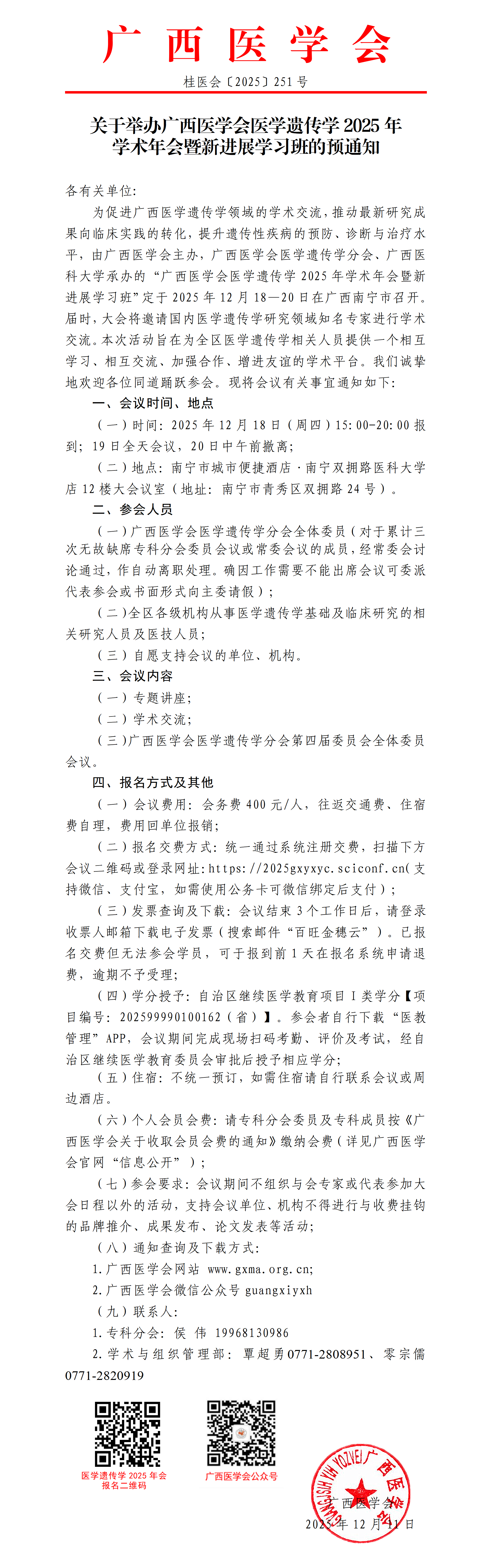 关于举办广西医学会医学遗传学2025年学术年会暨新进展学习班的预通知