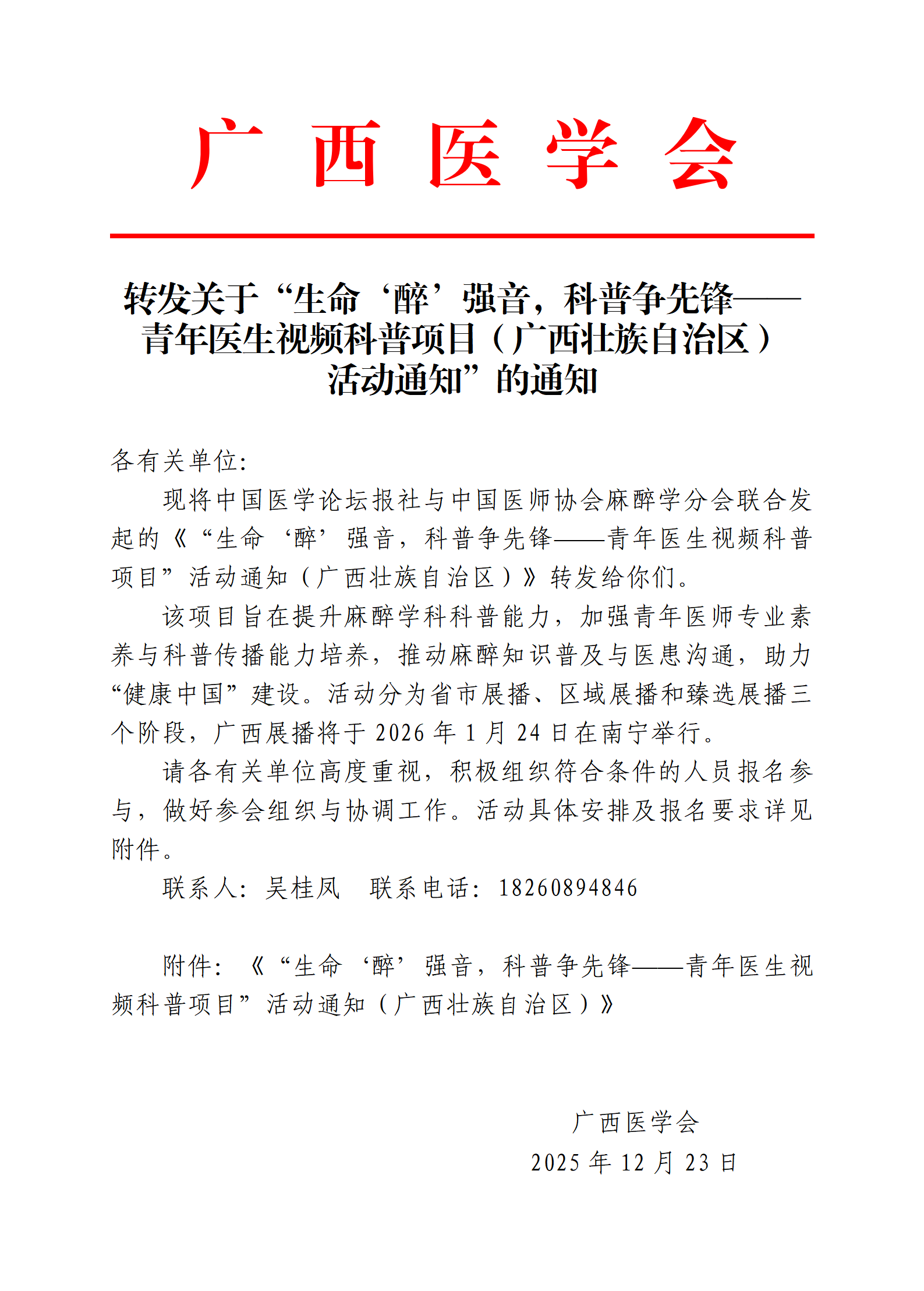 转发关于“生命‘醉’强音,科普争先锋—— 青年医生视频科普项目(广西壮族自治区) 活动通知”的通知