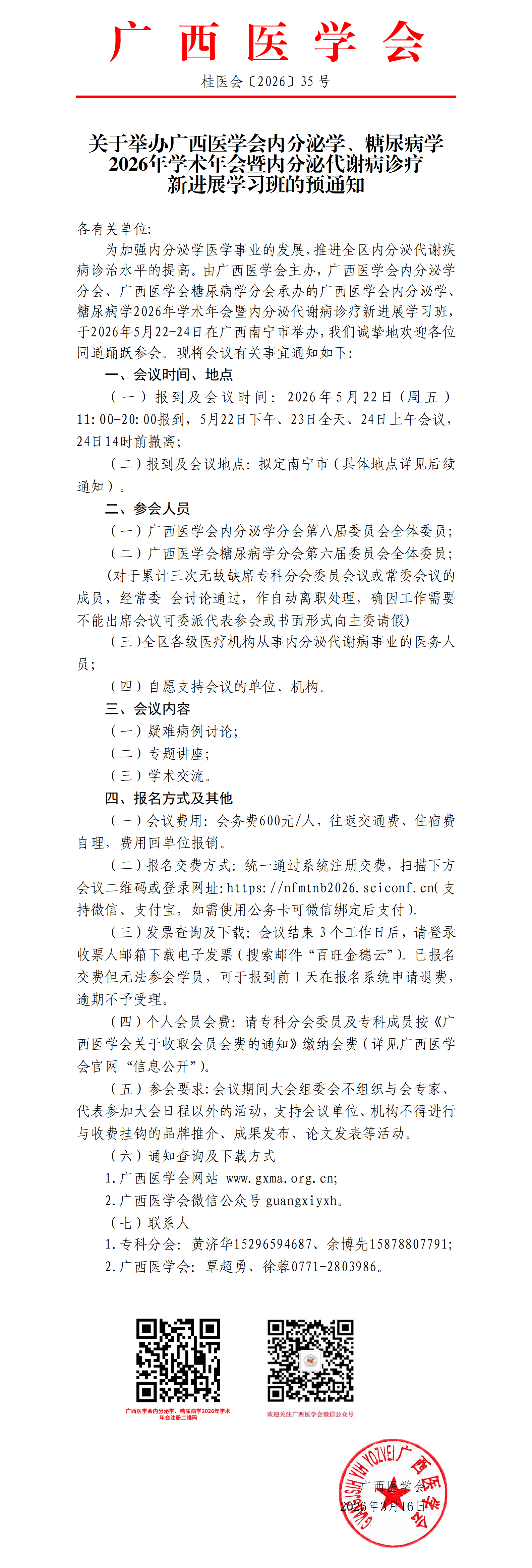 关于举办广西医学会内分泌学、糖尿病学2026年学术年会暨内分泌代谢病诊疗新进展学习班的预通知