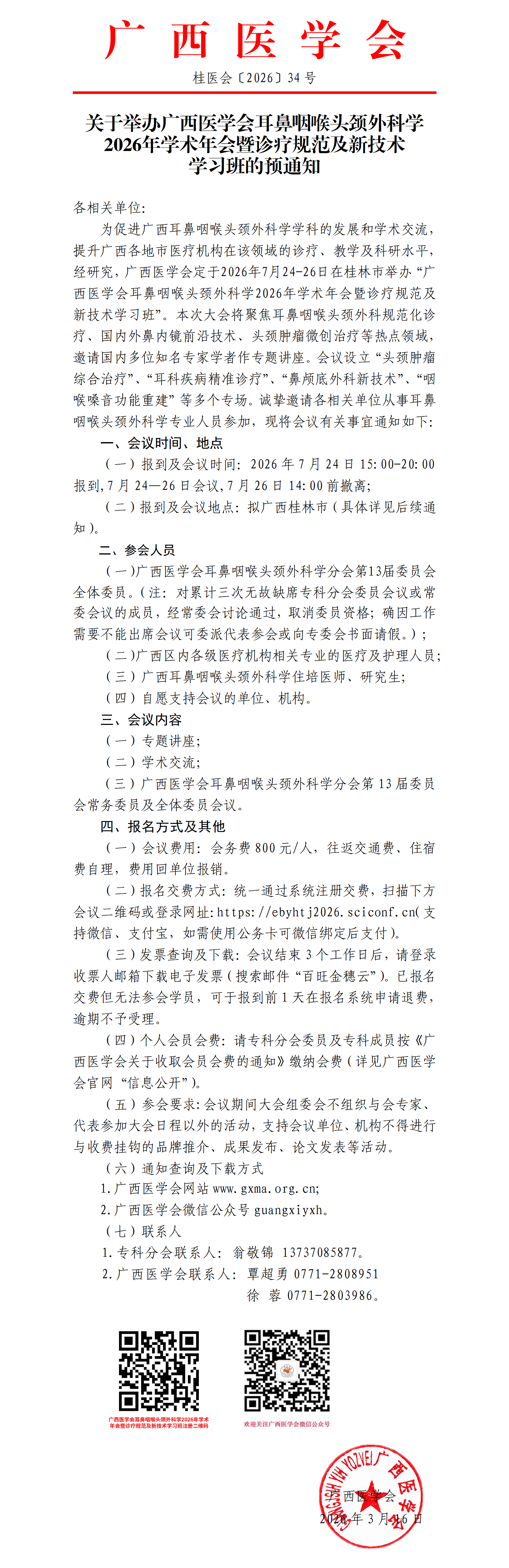 关于举办广西医学会耳鼻咽喉头颈外科学2026年学术年会暨诊疗规范及新技术学习班的预通知