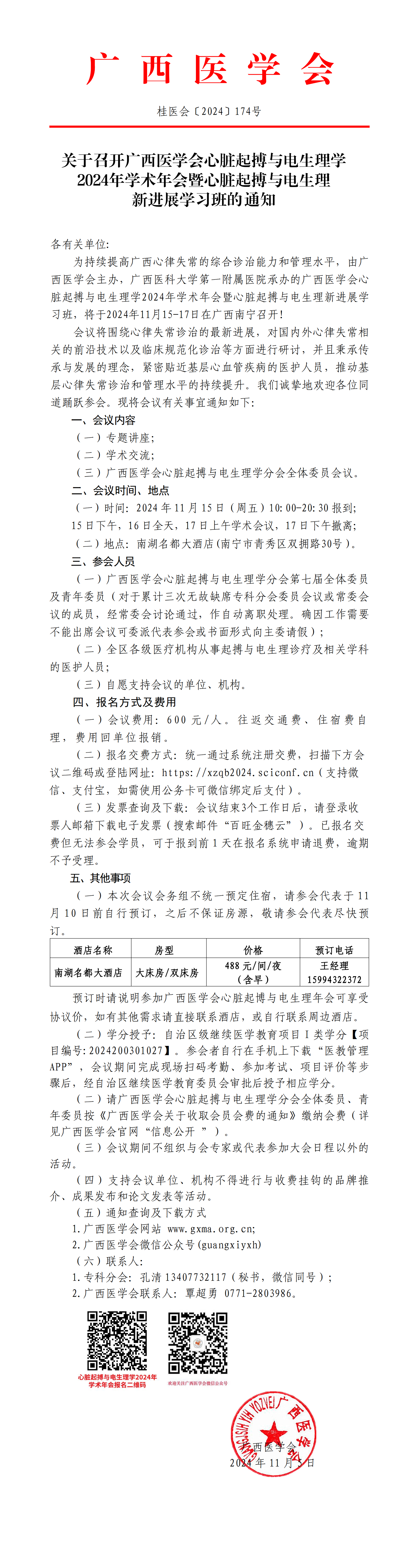 关于召开广西医学会心脏起搏与电生理学2024年学术年会暨心脏起搏与电生理 新进展学习班的通知