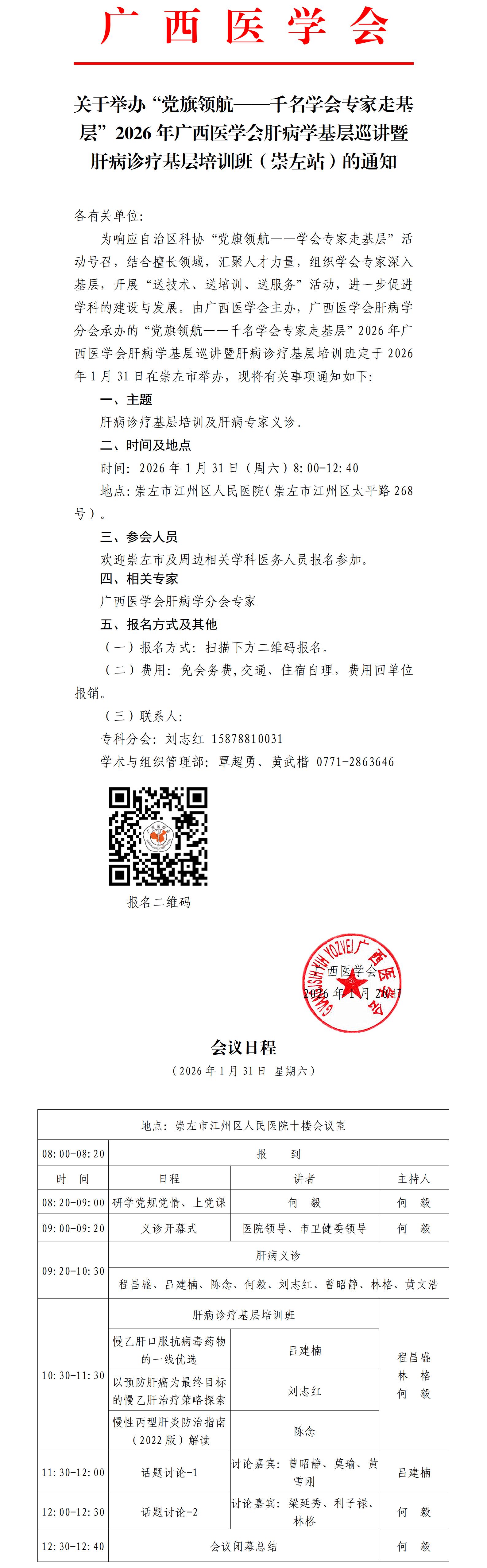 关于举办“党旗领航——千名学会专家走基层”2026年广西医学会肝病学分会基层巡讲暨肝病诊疗基层培训班(崇左站)的通知