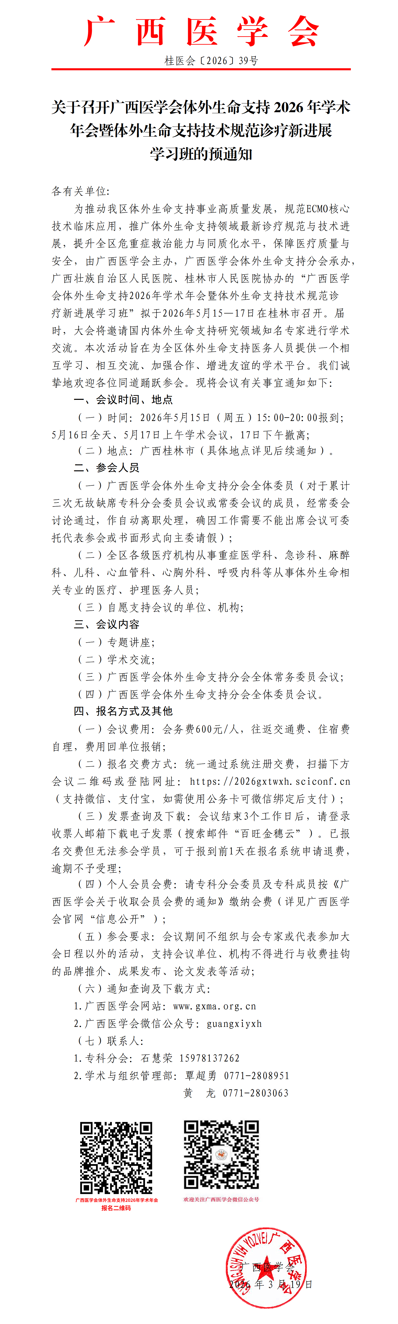 关于召开广西医学会体外生命支持2026年学术年会暨体外生命支持技术规范诊疗新进展学习班的预通知