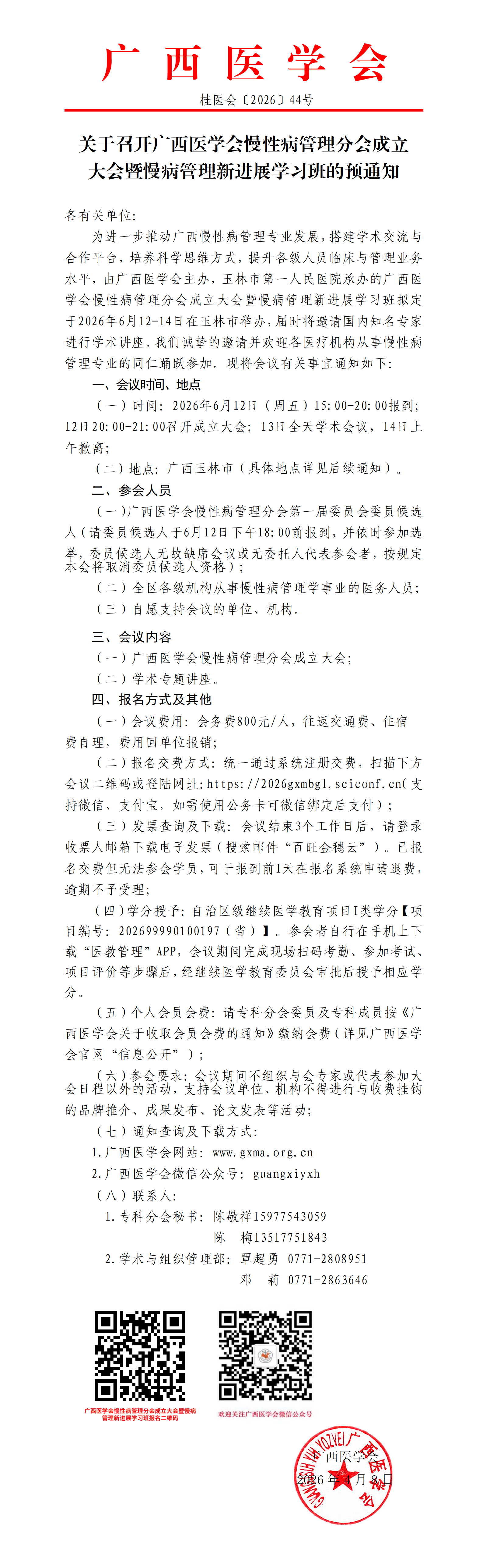关于召开广西医学会慢性病管理分会成立大会暨慢病管理新进展学习班的预通知