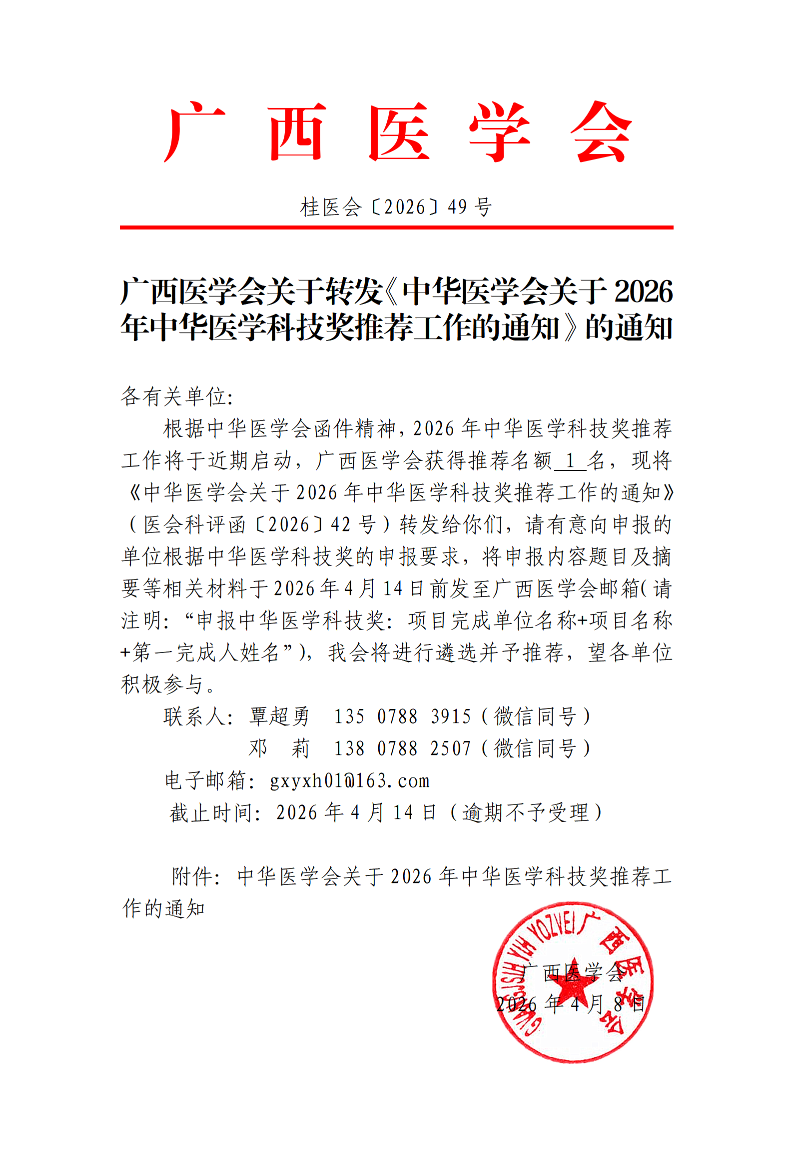 广西医学会关于转发中华医学科技奖推荐工作的通知