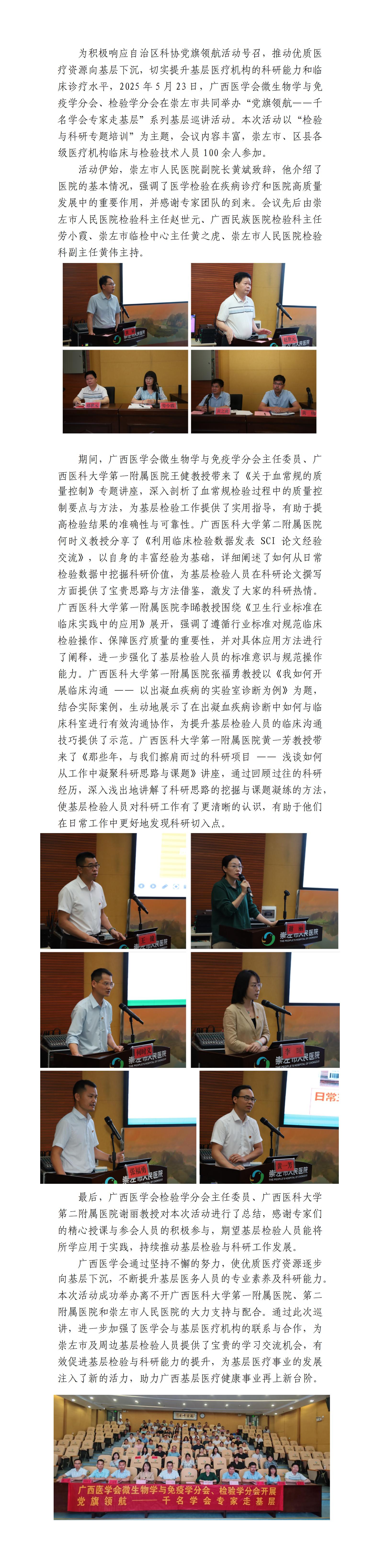 广西医学会微生物学与免疫学会、检验学分会共同开展“党旗领航—千名学会专家走基层”巡讲活动圆满举办(崇左站)