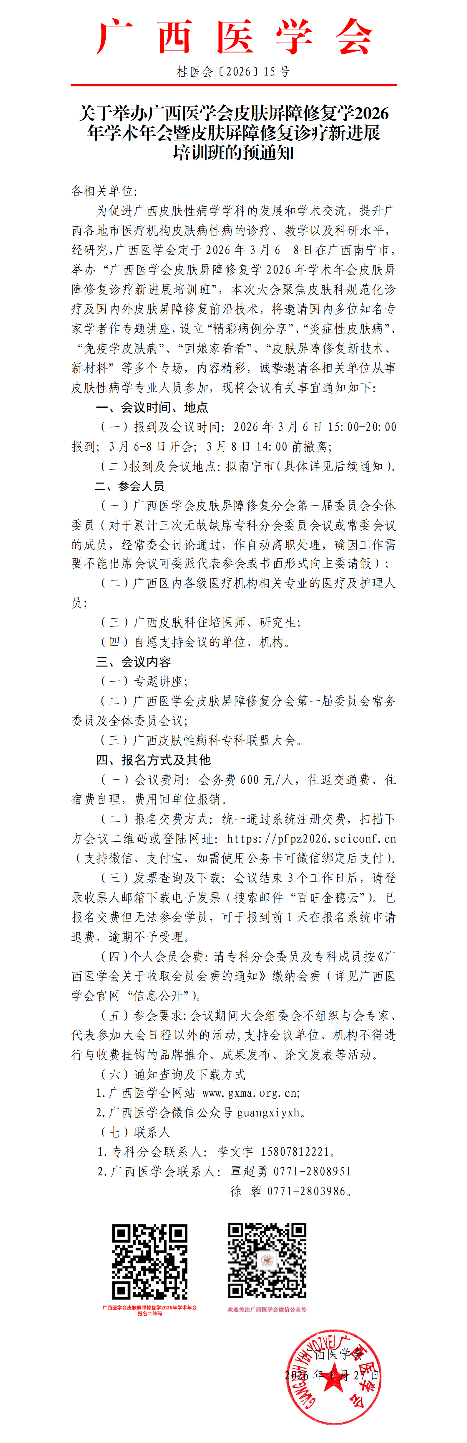 关于举办广西医学会皮肤屏障修复学2026年学术年会暨皮肤屏障修复诊疗新进展 培训班的预通知