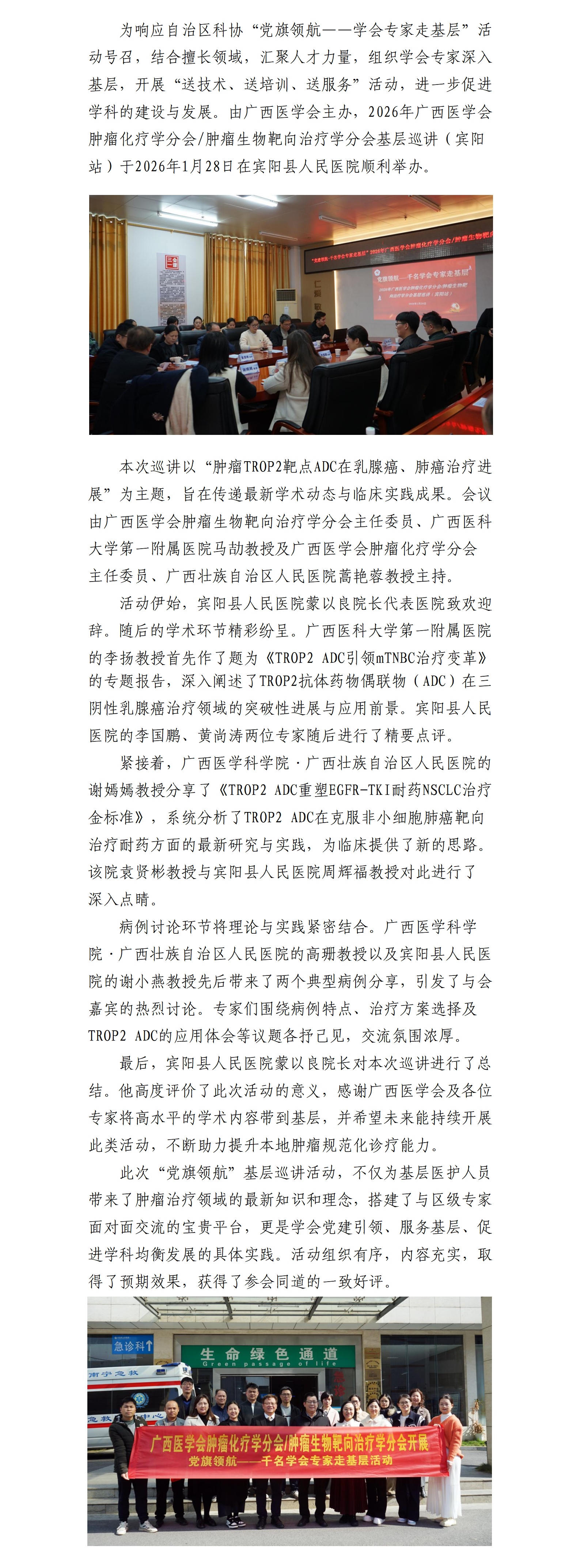 “党旗领航——千名学会专家走基层”2026年广西医学会肿瘤化疗学分会/肿瘤生物靶向治疗学分会基层巡讲(宾阳站)顺利举办