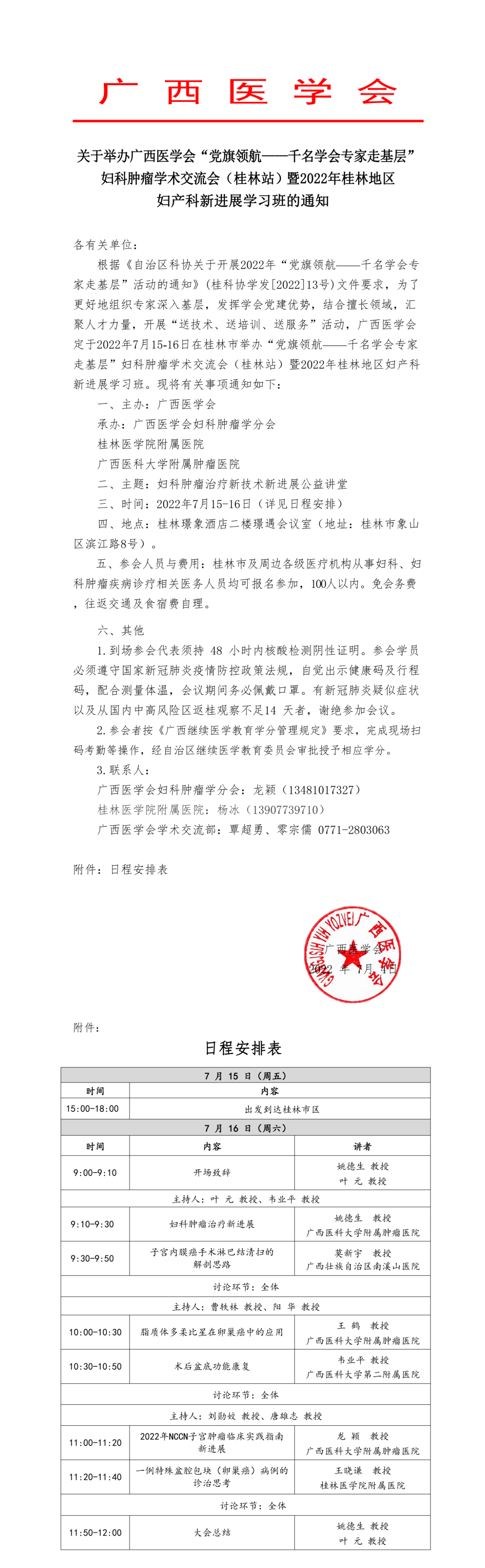 关于举办广西医学会“党旗领航——千名学会专家走基层” 妇科肿瘤学术交流会(桂林站)暨2022年桂林地区妇产科新进展学习班的通知
