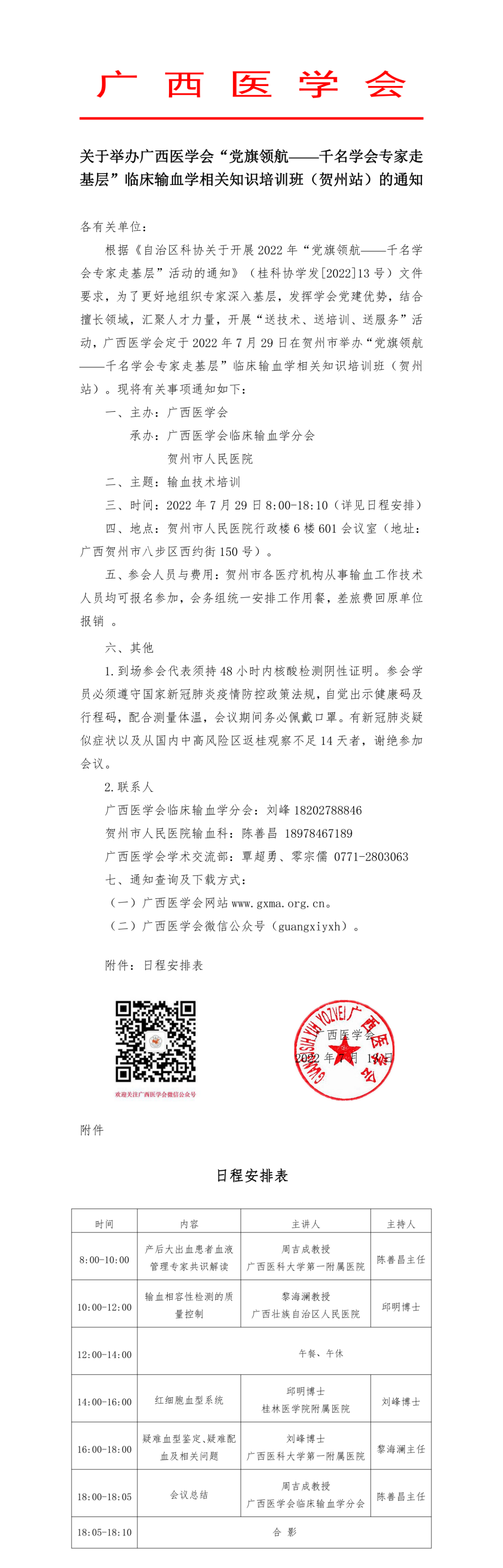 关于举办广西医学会“党旗领航——千名学会专家走 基层”临床输血学相关知识培训班(贺州站)的通知