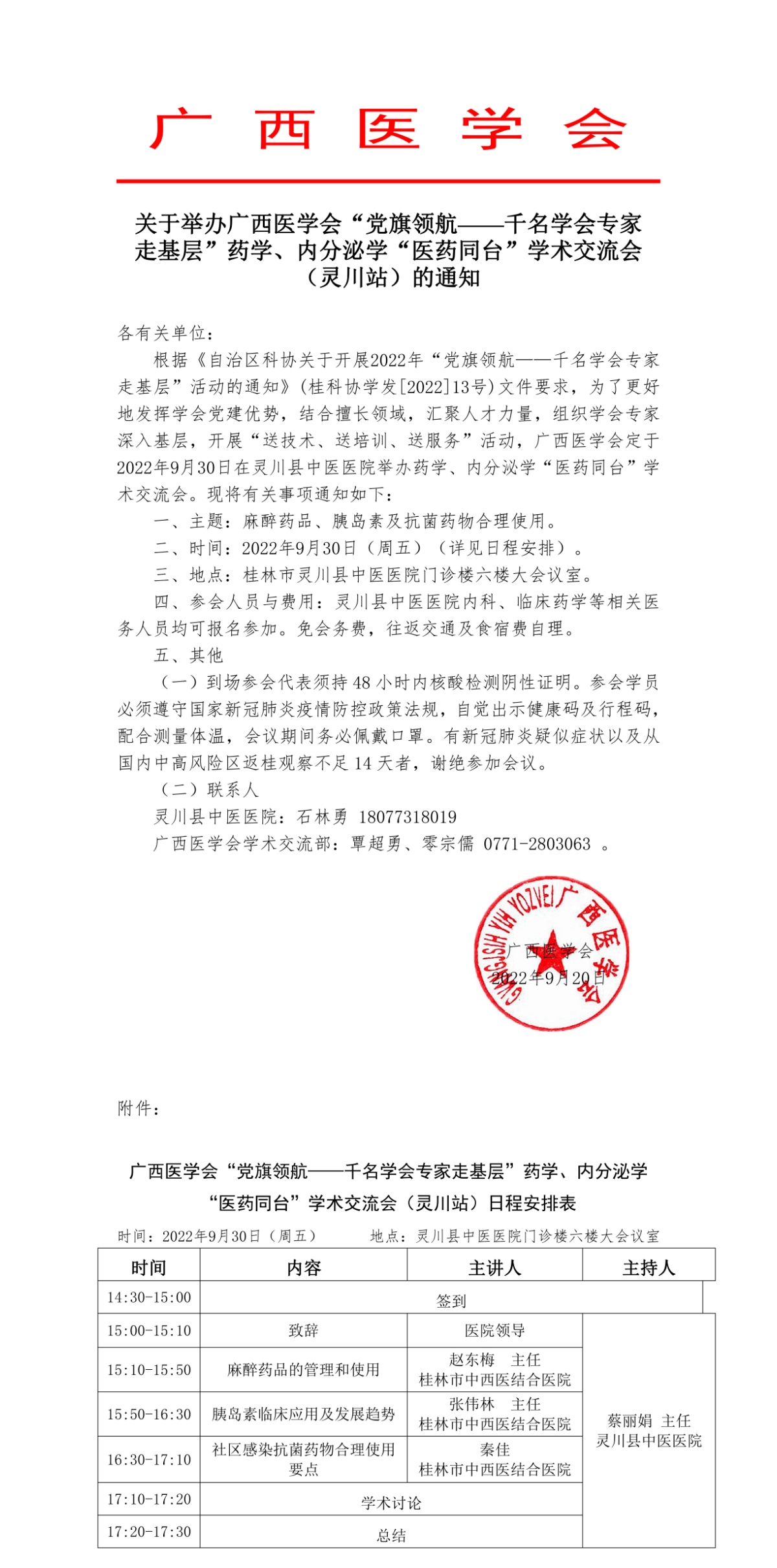 关于举办广西医学会“党旗领航——千名学会专家 走基层”药学、内分泌学“医药同台”学术交流会 (灵川站)的通知
