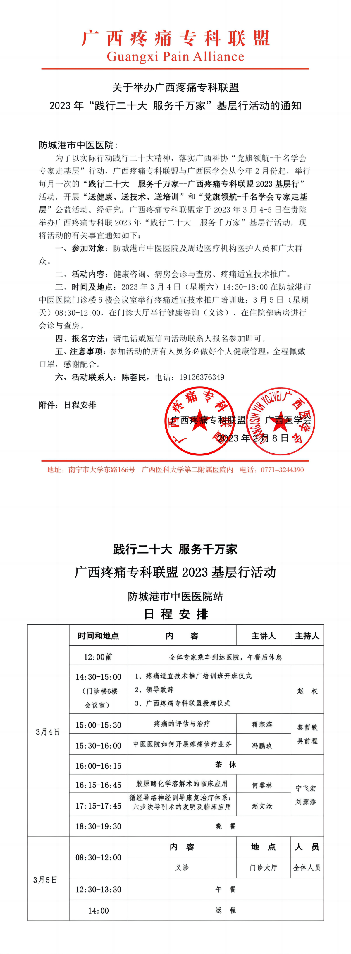 关于举办广西疼痛专科联盟2023年“践行二十大 服务千万家”基层行活动的通知-防城港中医医院站