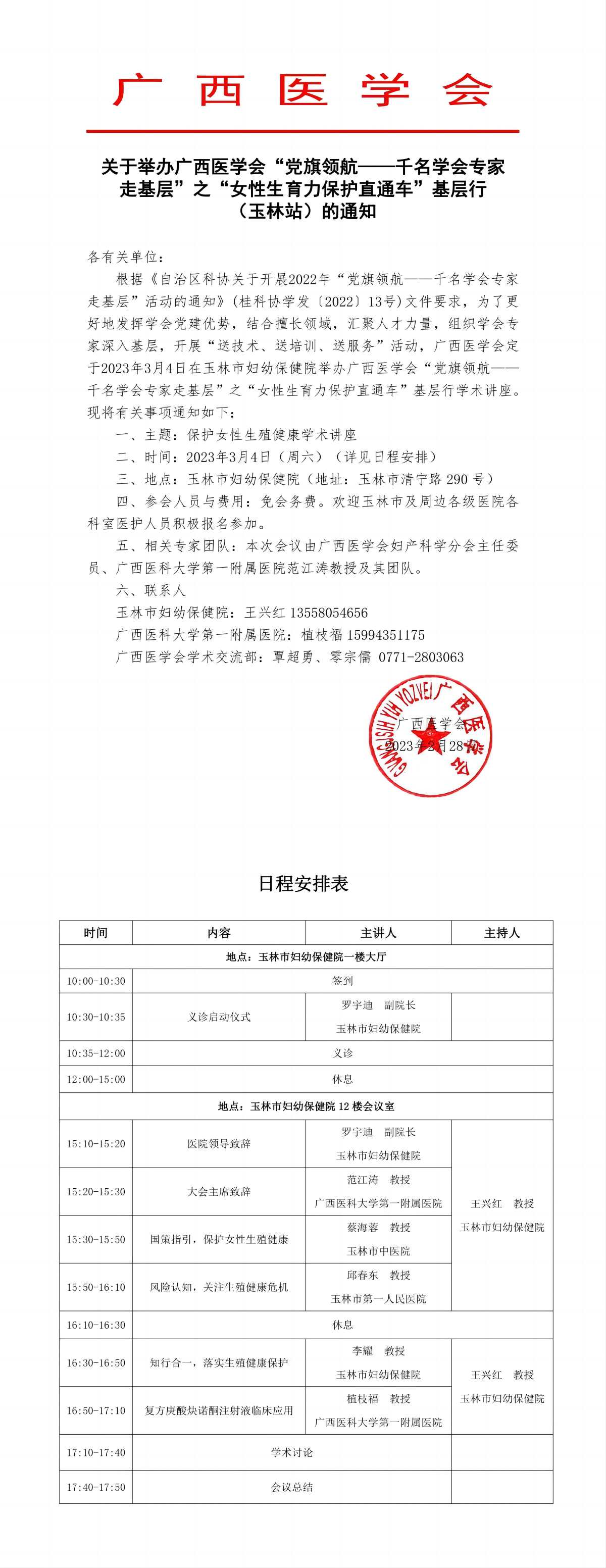 关于举办广西医学会“党旗领航——千名学会专家走基层”之“女性生育力保护直通车”基层行(玉林站)的通知