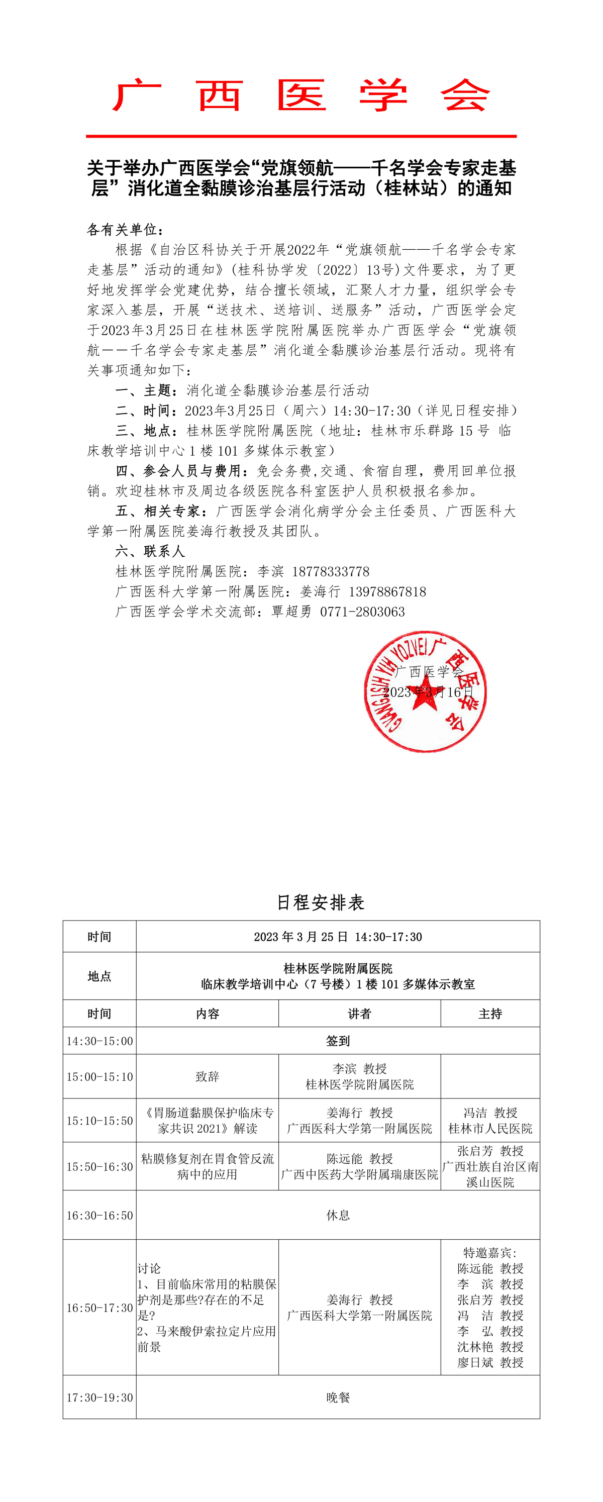 关于举办广西医学会“党旗领航——千名学会专家走基层”消化道全黏膜诊治基层行活动(桂林站)的通知