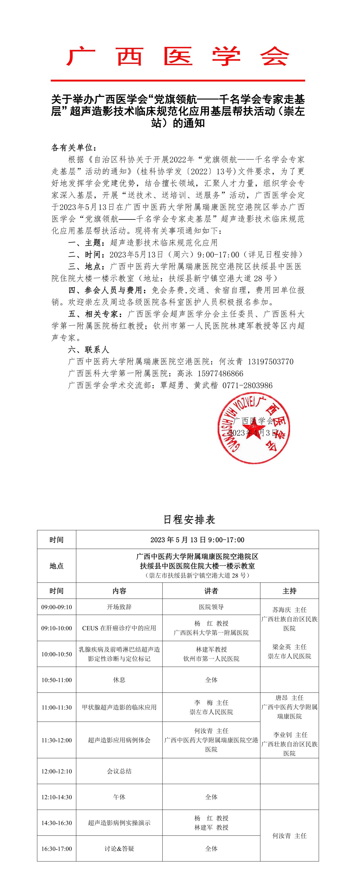 关于举办广西医学会“党旗领航——千名学会专家走基层”超声造影技术临床规范化应用基层帮扶活动(崇左站)的通知