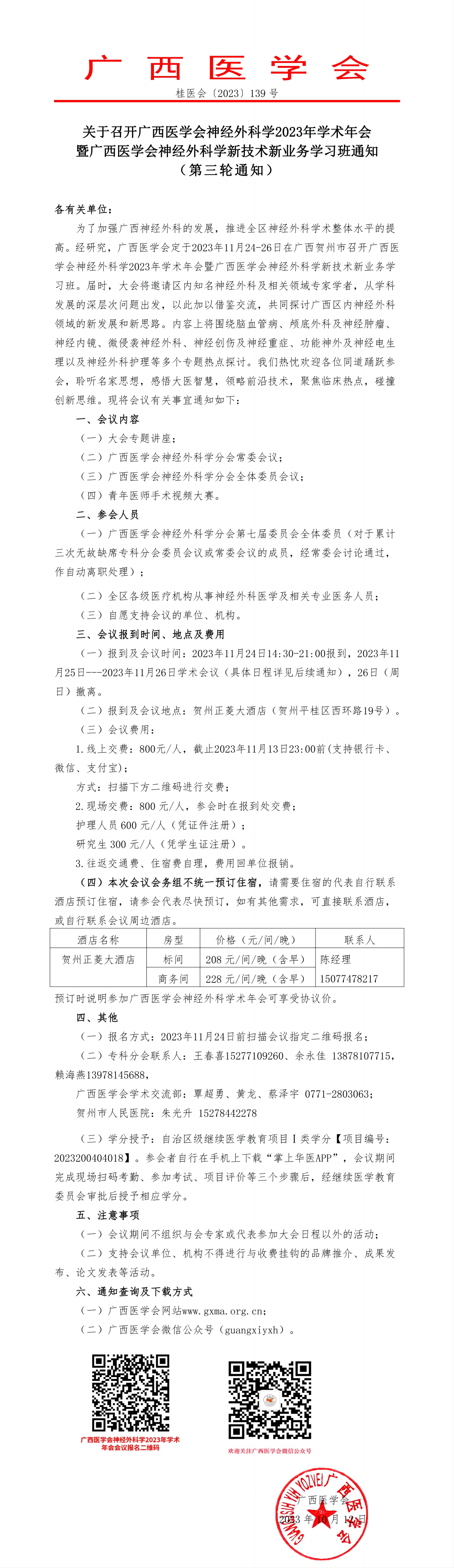 关于召开广西医学会神经外科学2023年学术年会暨广西医学会神经外科学新技术新业务学习班通知(第三轮通知)