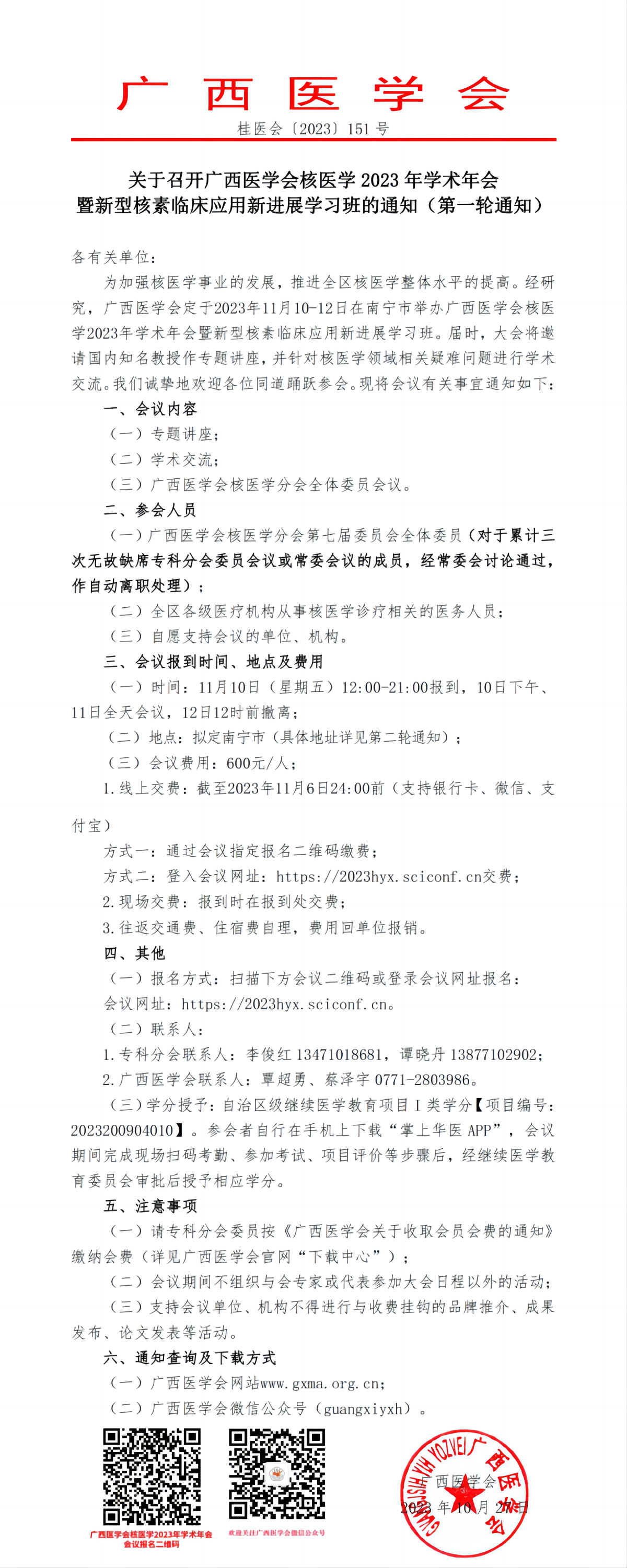 关于召开广西医学会核医学2023年学术年会暨新型核素临床应用新进展学习班的通知(第一轮通知)