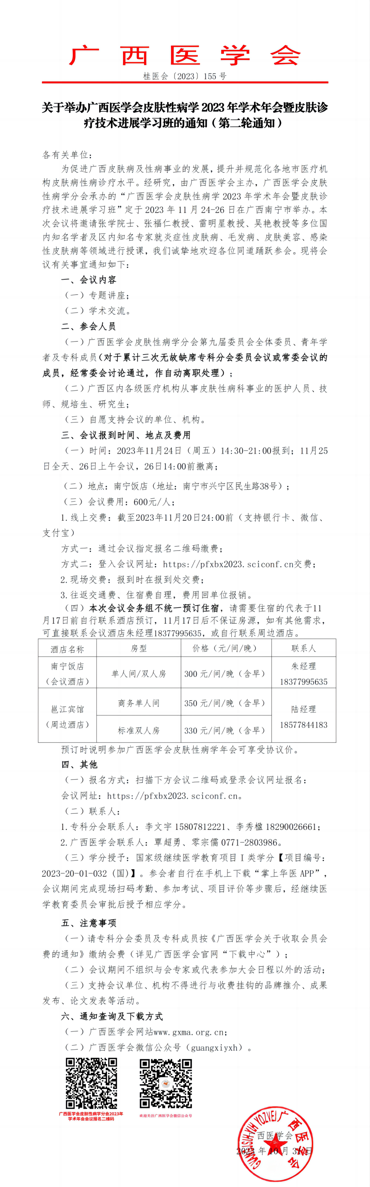 关于举办广西医学会皮肤性病学2023年学术年会暨皮肤诊疗技术进展学习班的通知(第二轮通知)