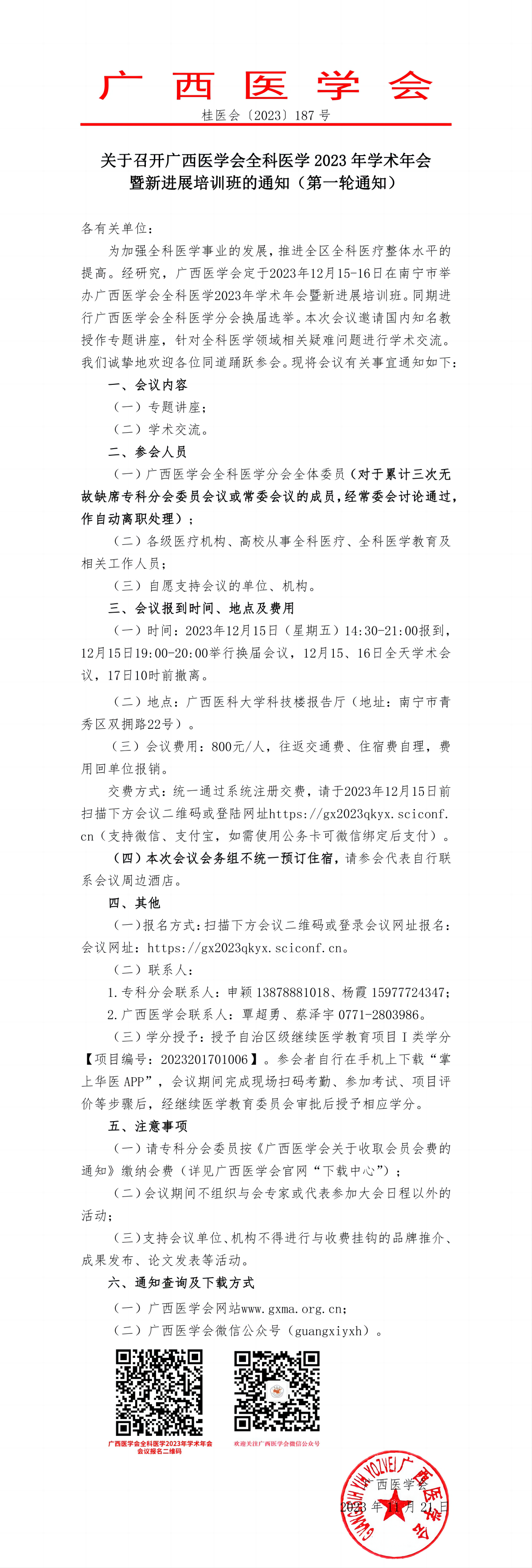 关于召开广西医学会全科医学2023年学术年会暨新进展培训班的通知(第一轮通知)