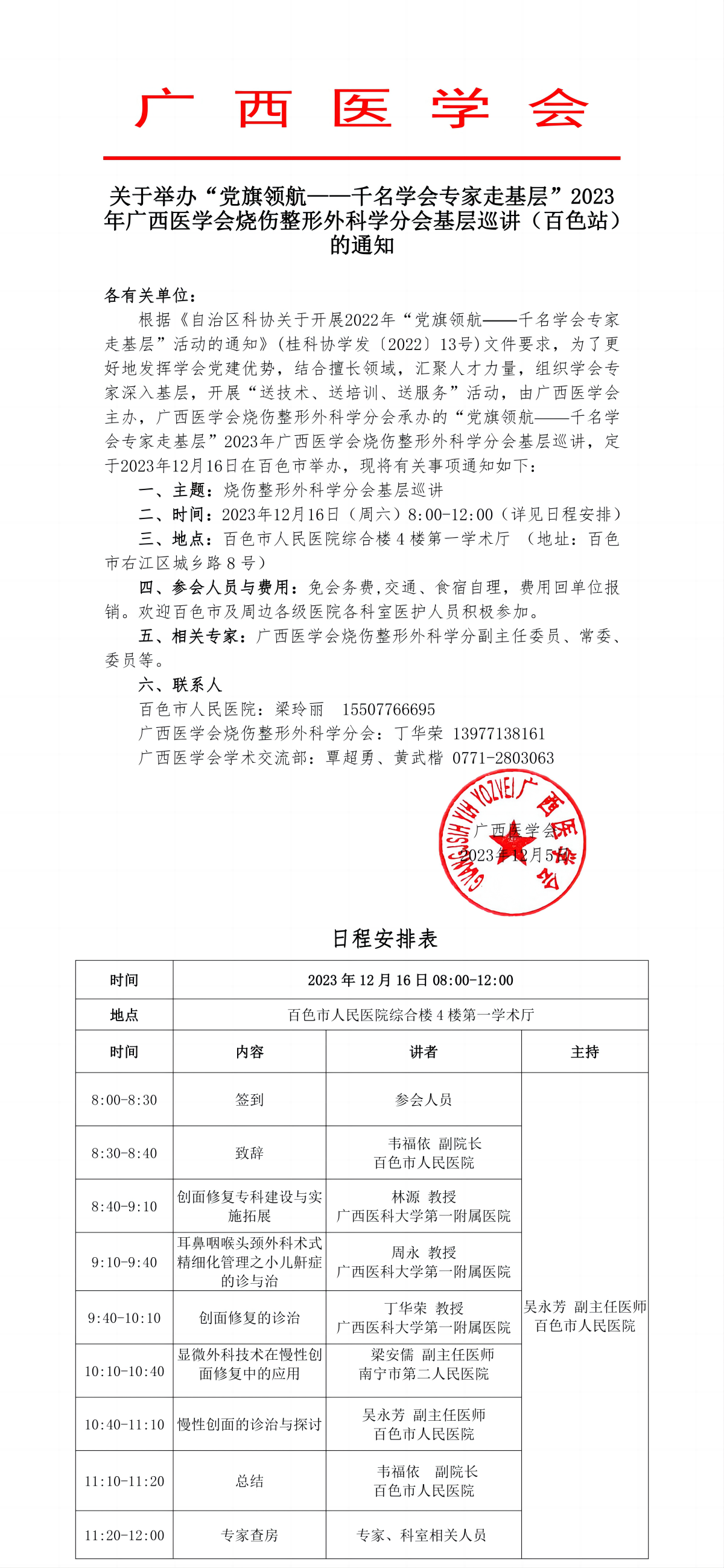 关于举办“党旗领航——千名学会专家走基层”2023年广西医学会烧伤整形外科学分会基层巡讲(百色站)的通知