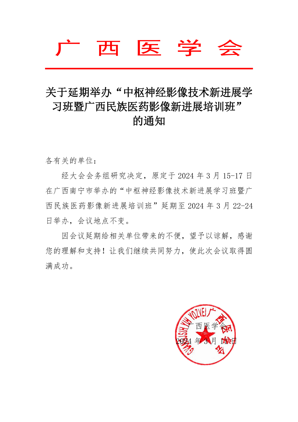 关于延期举办“中枢神经影像技术新进展学习班暨广西民族医药影像新进展培训班”的通知