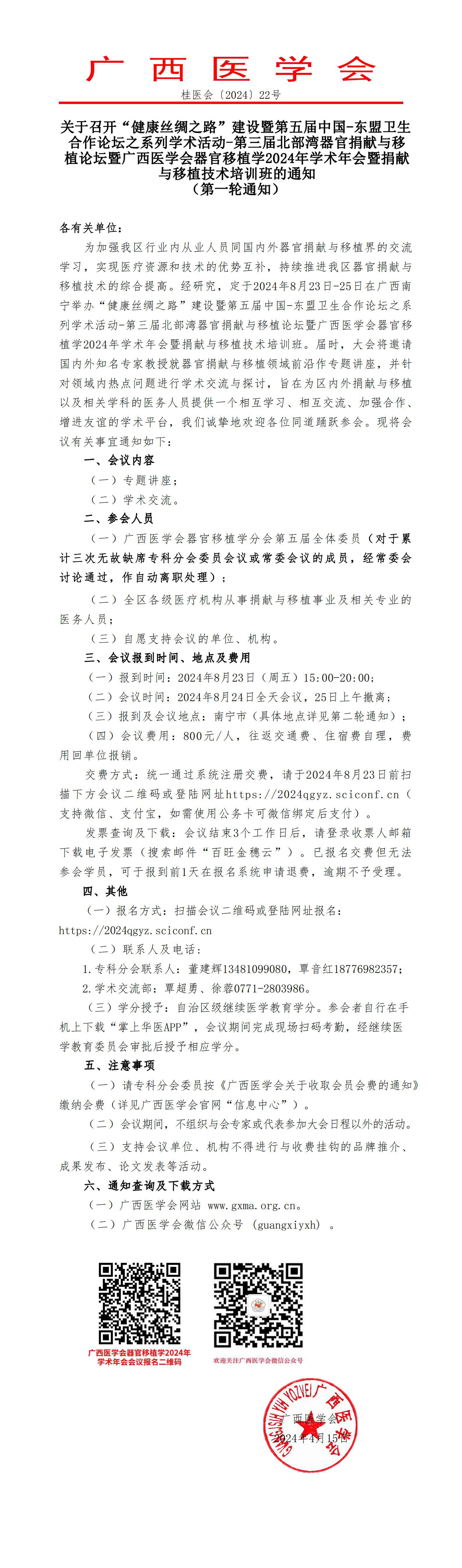 关于召开“健康丝绸之路”建设暨第五届中国-东盟卫生合作论坛之系列学术活动-第三届北部湾器官捐献与移植论坛暨广西医学会器官移植学2024年学术年会暨捐献与移植技术培训班的通知(第一轮通知)