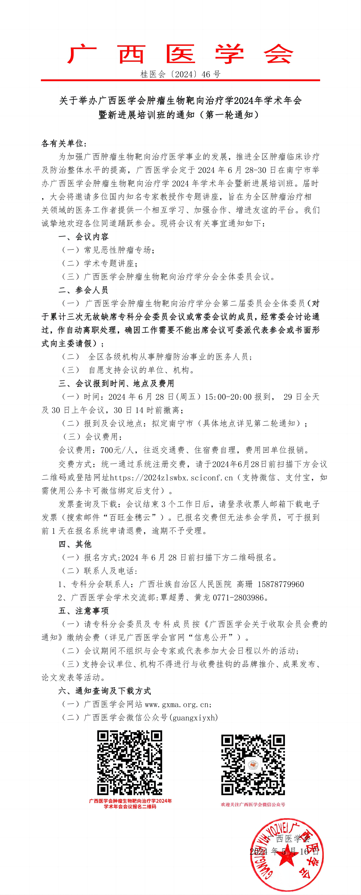 关于举办广西医学会肿瘤生物靶向治疗学2024年学术年会暨新进展培训班的通知(第一轮通知)