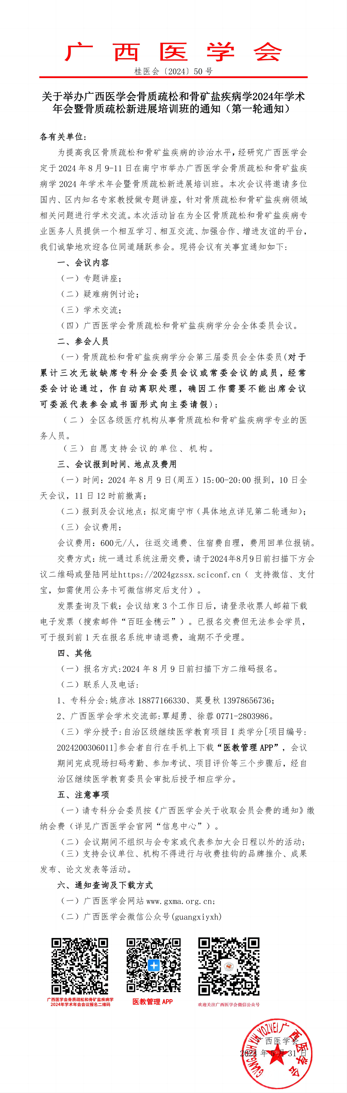 关于举办广西医学会骨质疏松和骨矿盐疾病学2024年学术年会暨骨质疏松新进展培训班的通知(第一轮通知)